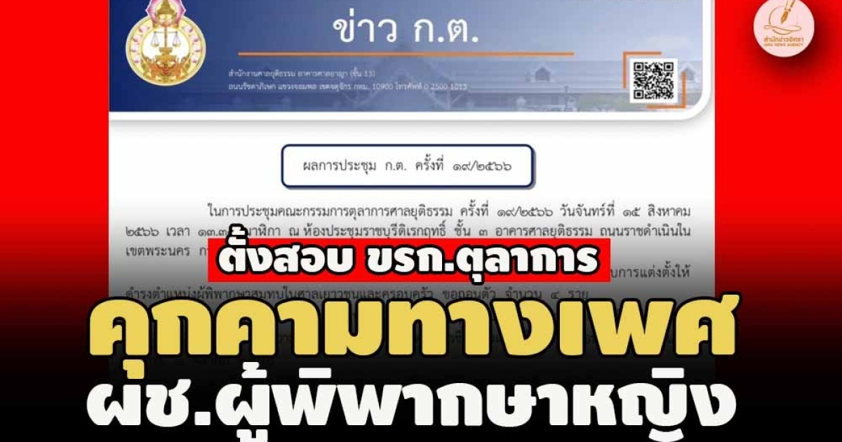 ที่ประชุม ก.ต. ตั้งกก.สอบสวนข้าราชการตุลาการประพฤติไม่เหมาะสม ไม่ให้เกียรติขรก.ชั้นผู้ใหญ่ คุกคามทางเพศผู้ช่วยผู้พิพากษาหญิง แสดงตนเป็นผู้กว้างขวางคบหากับบุคคล ชี้เป็นความผิดวินัยร้ายแรง -พิจารณากรณีพักราชการอีก 1 ราย