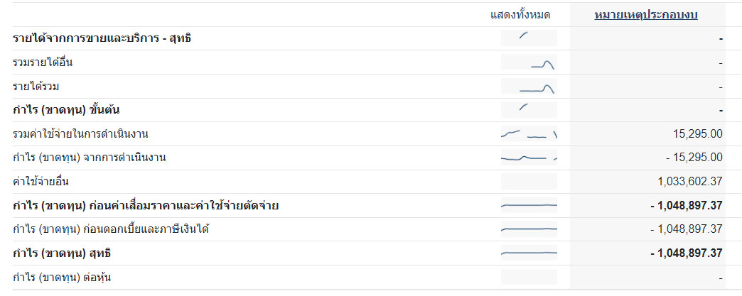 เมื่อสืบค้นข้อมูลงบการเงินแสดงผลประกอบการธุรกิจล่าสุด ที่ยื่นต่อกรมพัฒนาธุรกิจการค้า ในฐานข้อมูลออกไลน์ ณ 31 ธ.ค.2565 แจ้งว่า ไม่มีรายได้จากการขายและบริการ รวมค่าใช้จ่ายในการดำเนินงาน 15,295.00 บาท ขาดทุนจากการดำเนินงาน 15,295.00 บาท ค่าใช้จ่ายอื่น 1,033,602.37 บาท ขาดทุนสุทธิ 1,048,897.37 บาท
