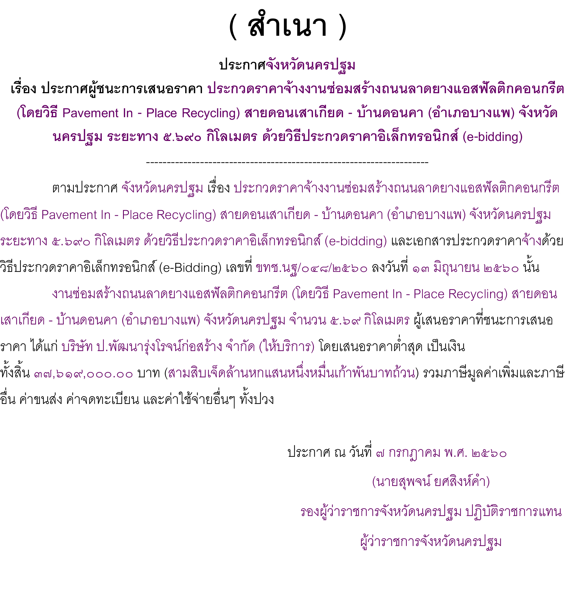 จังหวัดนครปฐมโดยรองผู้ว่าฯประกาศให้ บริษัท ป.พัฒนารุ่งโรจน์ก่อสร้าง เป็นผู้ชนะการประกวดราคา เมื่อ 7 ก.ค.2560 โดยเสนอราคา ต่ำกว่า บริษัท ท่ามะกาแอสฟัลท์ จำกัด จำนวน 46,000 บาท และ เข้าทำสัญญาวันที่ 14 ก.ค.2560