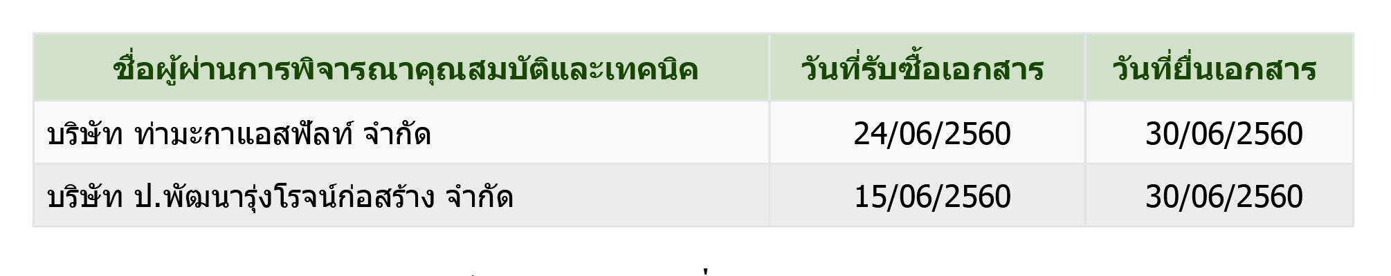 ยื่นเอกสาร 2 รายคือ บริษัท ป.พัฒนารุ่งโรจน์ก่อสร้าง จำกัด และ บริษัท ท่ามะกาแอสฟัลท์ จำกัดและผ่านการพิจารณาคุณสมบัติและเทคนิคทั้งสองราย