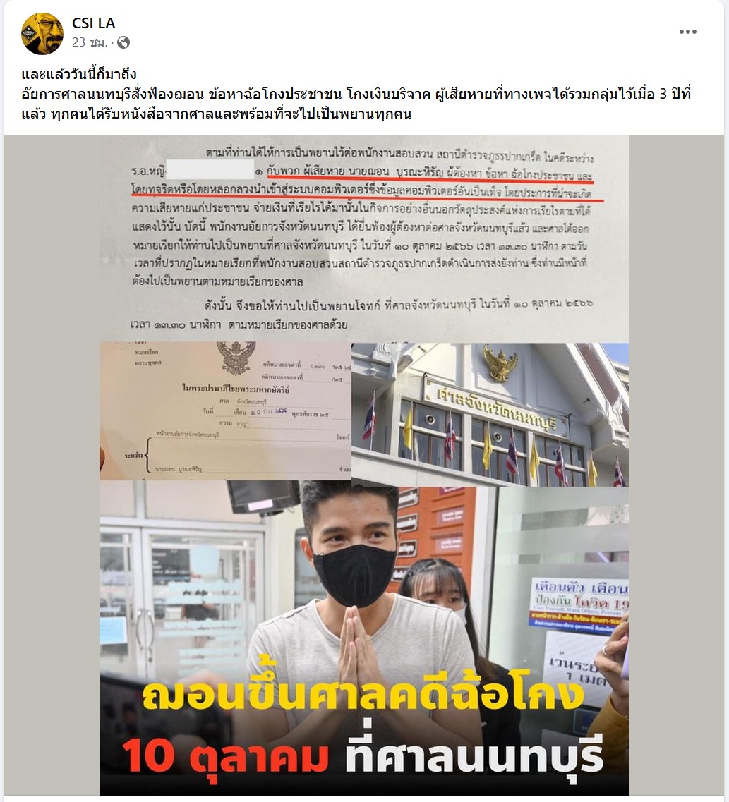 โดยในเอกสารที่ทางเพจ ออกมาเปิดเผย ศาลได้ออกหมายเรียก นัดผู้เสียหายเป็นพยานในวันที่ 10 ต.ค. 2566 เวลา 13.30 น.