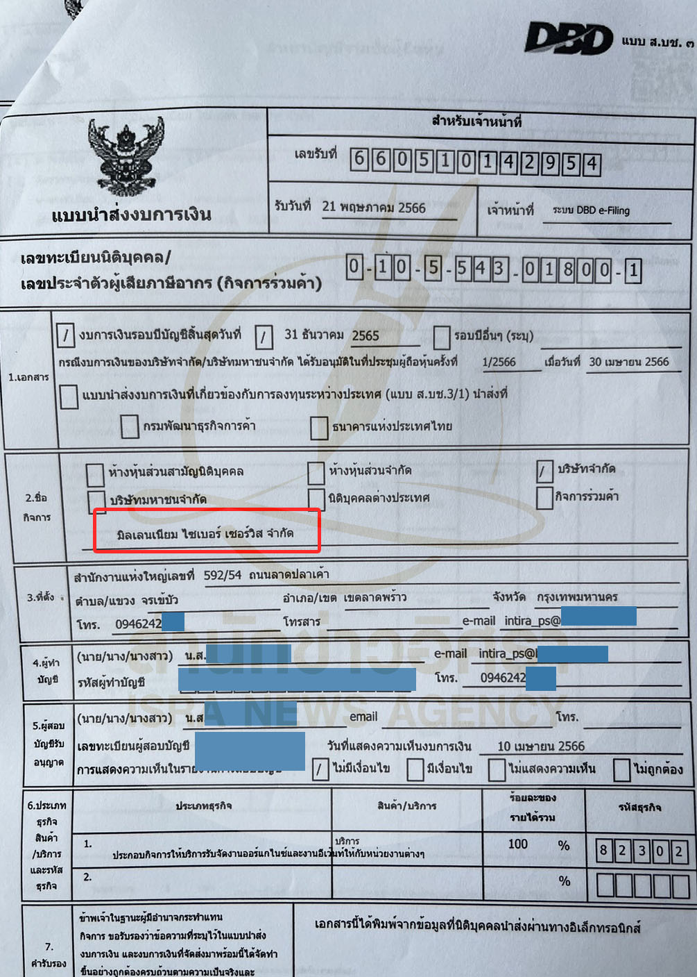 นอกจากนี้ ทั้ง 2 บริษัท ยังใช้ผู้ทำบัญชีคนเดียวกัน คือ น.ส. ก. (ขอสงวนชื่อ-นามสกุล) ระบุ เบอร์โทรศัพท์ 0946242XXX และอีเมล intira_ps@XXX เดียวกับ บริษัทวินเทคซาวด์ จำกัด บริษัท มิลเลนเนียม ไซเบอร์ เซอร์วิส จำกัด ด้วย
