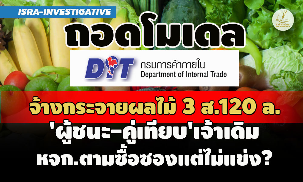 ISRA-INVESTIGATIVE : ประเด็นตรวจสอบข้อมูลเชิงลึก งานจัดซื้อจัดจ้างโครงการที่เกี่ยวข้องกับการกระจายผลไม้ออกนอกแหล่งผลิต ของ กรมการค้าภายใน (กน.) ที่ใช้วิธีคัดเลือก ซึ่งถูกวิพากษ์วิจารณ์เรื่องการใช้จ่ายเงินงบประมาณภาครัฐ ในช่วงระหว่างรอเปลี่ยนผ่านรัฐบาลชุดใหม่ จำนวนหลายสัญญา รวมวงเงินกว่า 200 ล้านบาท