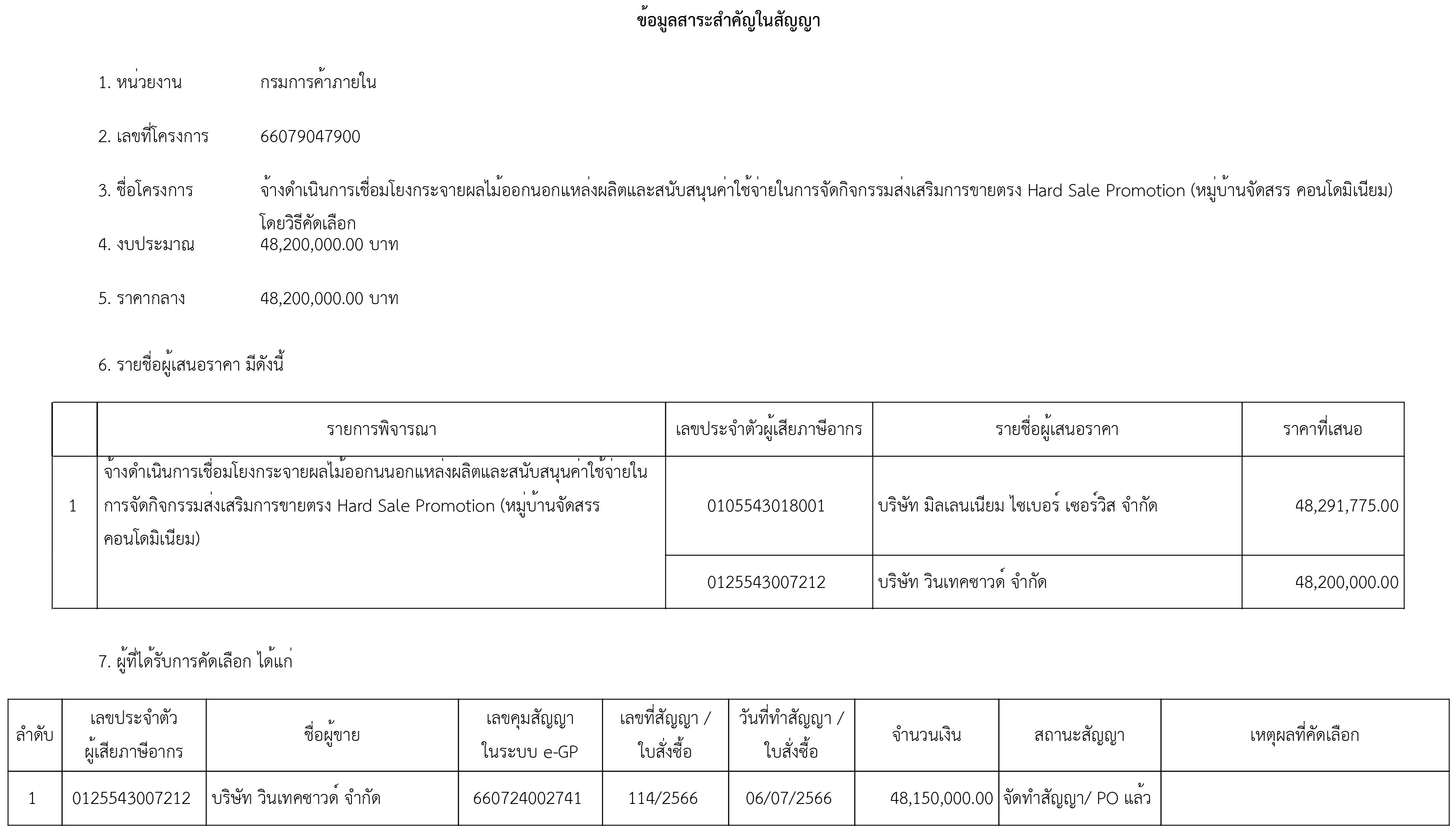 ล่าสุด สำนักข่าวอิศรา สืบค้นข้อมูลงานจัดซื้อจัดจ้างโครงการที่เกี่ยวข้องกับการกระจายผลไม้ออกนอกแหล่งผลิต ของ กรมการค้าภายใน (กน.) ที่ใช้วิธีคัดเลือก เพิ่มเติมพบว่า บริษัทวินเทคซาวด์ จำกัด ผู้ชนะ งานจ้างดำเนินการเชื่อมโยงกระจายผลไม้นอกแหล่งผลิตและสนับสนุนค่าใช้จ่ายในการจัดกิจการส่งเสริมการขายตรง Hard Sale Promotion หมู่บ้านจัดสรร คอนโดมิเนียม) โดยวิธีคัดเลือก วงเงิน 48,150,000 บาท ในช่วงเดือน พ.ค.2566