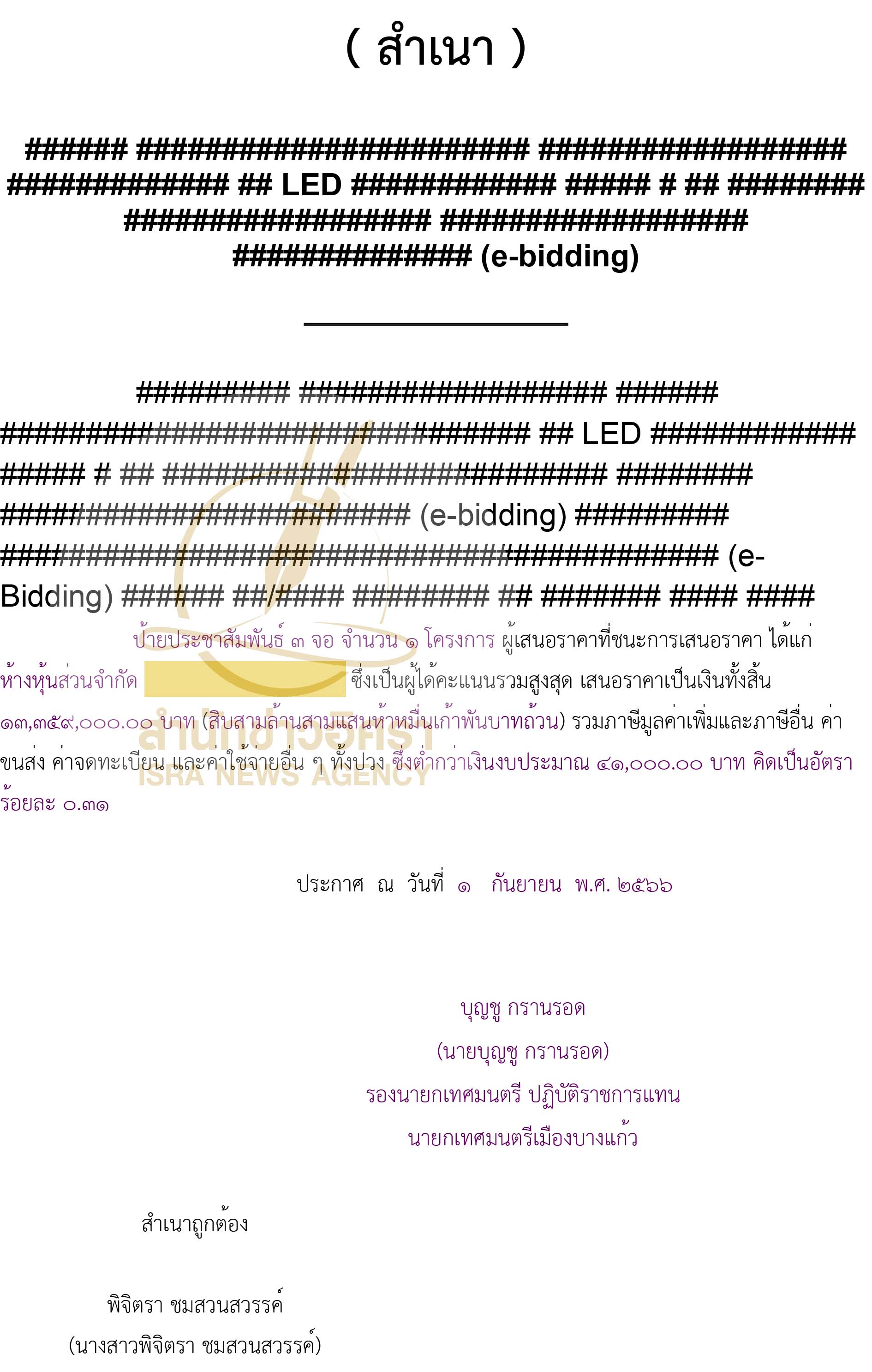 เมื่อวันที่ 1 กันยายน 2566 เทศบาลเมืองบางแก้ว ได้เผยแพร่ประกาศรายชื่อผู้ชนะการประกวดราคางานโครงการฯ นี้ เป็นทางการ โดยวิธีประกวดราคาอิเล็กทรอนิกส์ (e-Bidding)