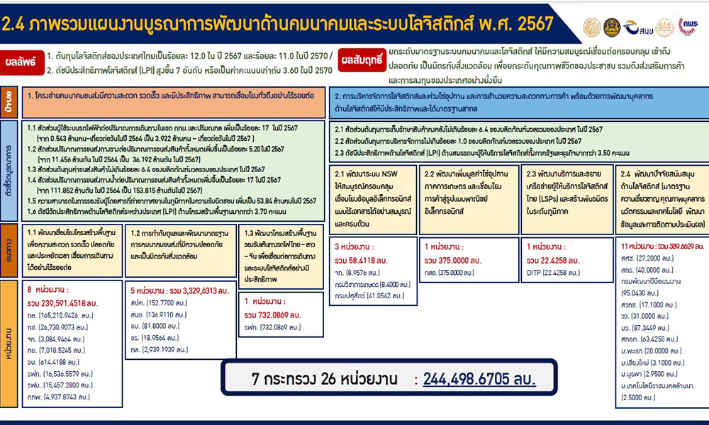 ระบบโลจิสติกส์ ปี พ.ศ. 2567 นี้ ถือได้ว่า มีความสำคัญเป็นอย่างมาก เนื่องจากจะเป็นเครื่องมือสำคัญในการลงทุนโครงสร้างพื้นฐานที่สำคัญต่อการพัฒนาและเพิ่มขีดความสามารถในการแข่งขันของประเทศ โดยมีโครงการสำคัญที่ได้พิจารณาเพิ่มเติมในคราวนี้ และมีวงเงินเกิน 1,000 ล้านบาท เช่น โครงการก่อสร้างทางแนวใหม่ ทางเลี่ยงเมืองอ่างทอง โครงการขยายทางหลวงหมายเลข 3 ระยอง - บ้านเพ และโครงการก่อสร้างทางแยกต่างระดับจุดตัดทางหลวง แยกท่าเรือ จ.ภูเก็ต และก่อสร้างจุดตัดทางหลวง แยกแก่งเสี้ยนและแยกวังสารภี อ.เมือง จ.กาญจนบุรี และโครงการขยายท่าอากาศยานชุมพรและระนอง ซึ่งจะเป็นโครงการสำคัญที่ช่วยแก้ไขปัญหา Missing Link และลดปัญหาคอขวด รวมถึงช่วยให้การพัฒนาด้านคมนาคมและระบบโลจิสติกส์บรรลุเป้าหมายเป็นไปตามตัวชี้วัดที่ช่วยลดต้นทุนโลจิสติกส์ของประเทศให้ลดลง และเพิ่มอันดับดัชนีประสิทธิภาพโลจิสติกส์ระหว่างประเทศ (LPI) ของไทยให้สูงขึ้น โดยอยู่ภายใน 25 อันดับแรกในปี 2570