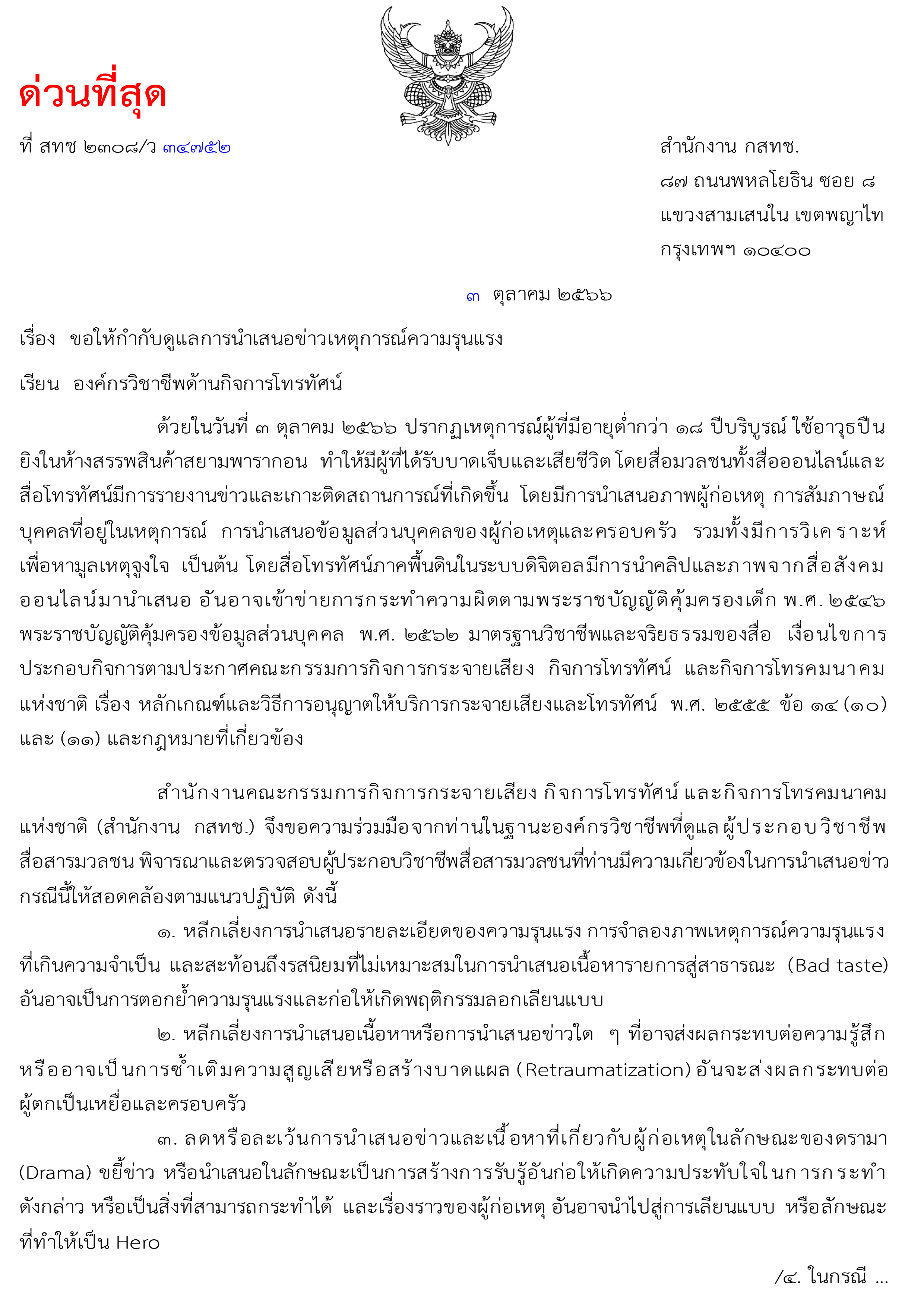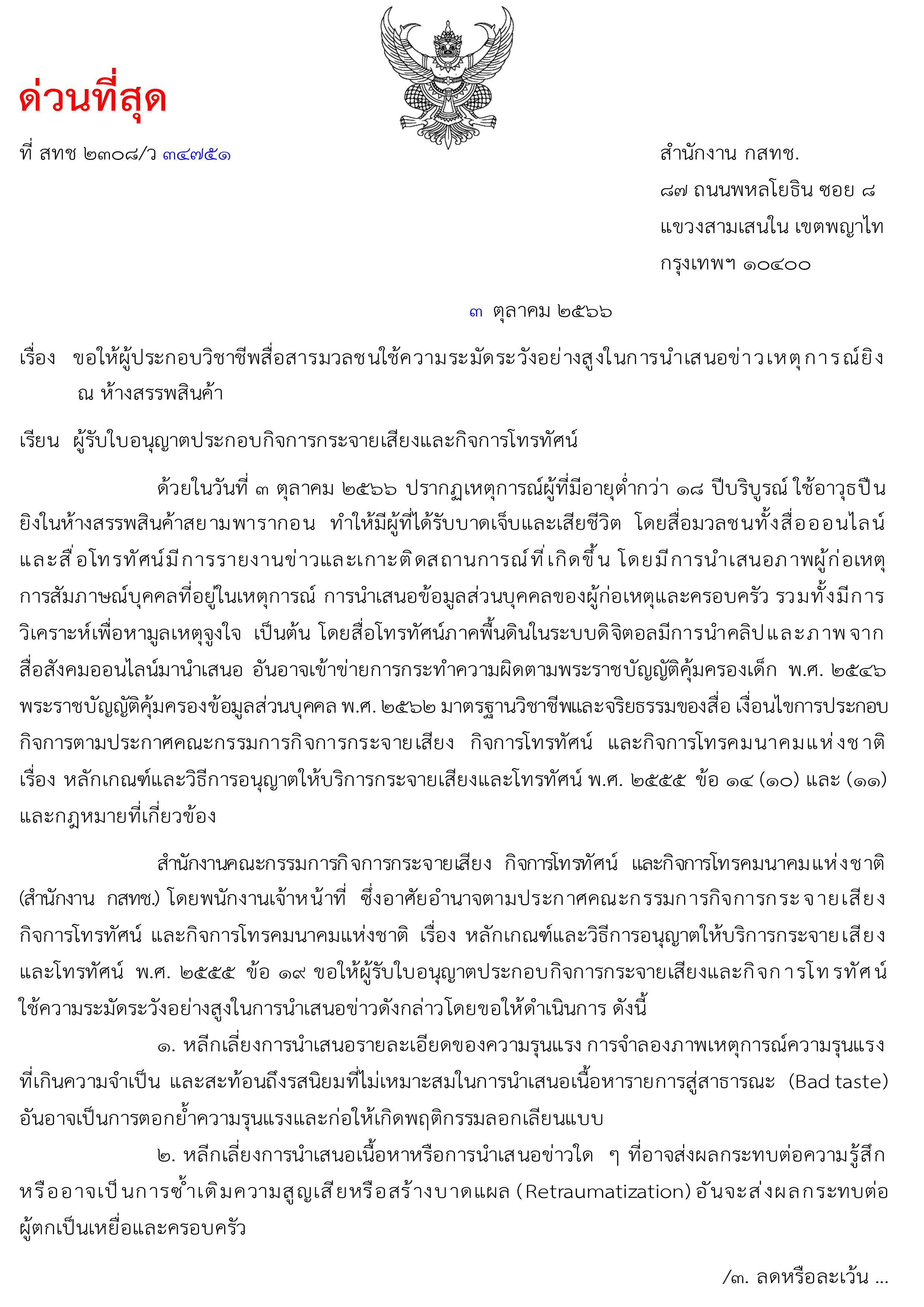 กสทช.จ่อฟันช่องทีวีดิจิทัลแพร่ประวัติ ชื่อ รูปภาพ ผู้ก่อเหตุกราดยิงในกลางสยามพารากอน อายุต่ำกว่า 18 ปี ออกหนังสือด่วนที่สุดแจ้งเตือนองค์กรวิชาชีพ -ผู้รับใบอนุญาต กำกับดูแลใช้ความระมัดระวังอย่างสูงนำเสนอข่าว ลด/ละเว้นดรามา ขยี้ข่าว สร้างการรับรู้ ลอกเลียนแบบ-เป็น Hero