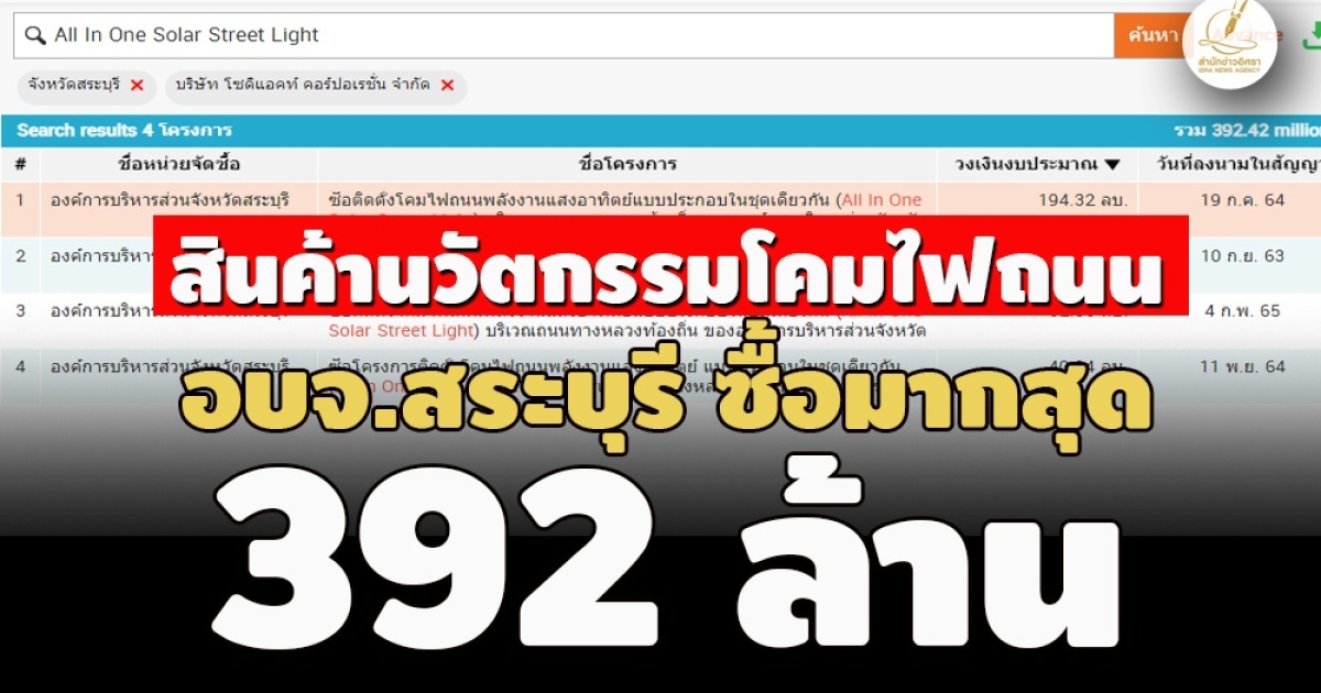 หลังเปิดตัวเอกชนกลุ่ม 2 ขายสินค้านวัตกรรมโคมไฟถนน ได้งานอปท.ทั่วปท. 1,514 ล้าน ล่าสุดอิศรา สอบพบ 6 อบจ. สนองนโยบายรัฐจัดซื้อเพียบ สระบุรี มากสุด 392.42 ล้าน อุตรดิตถ์ เอา 7 โครงการ 248.41 ล้าน