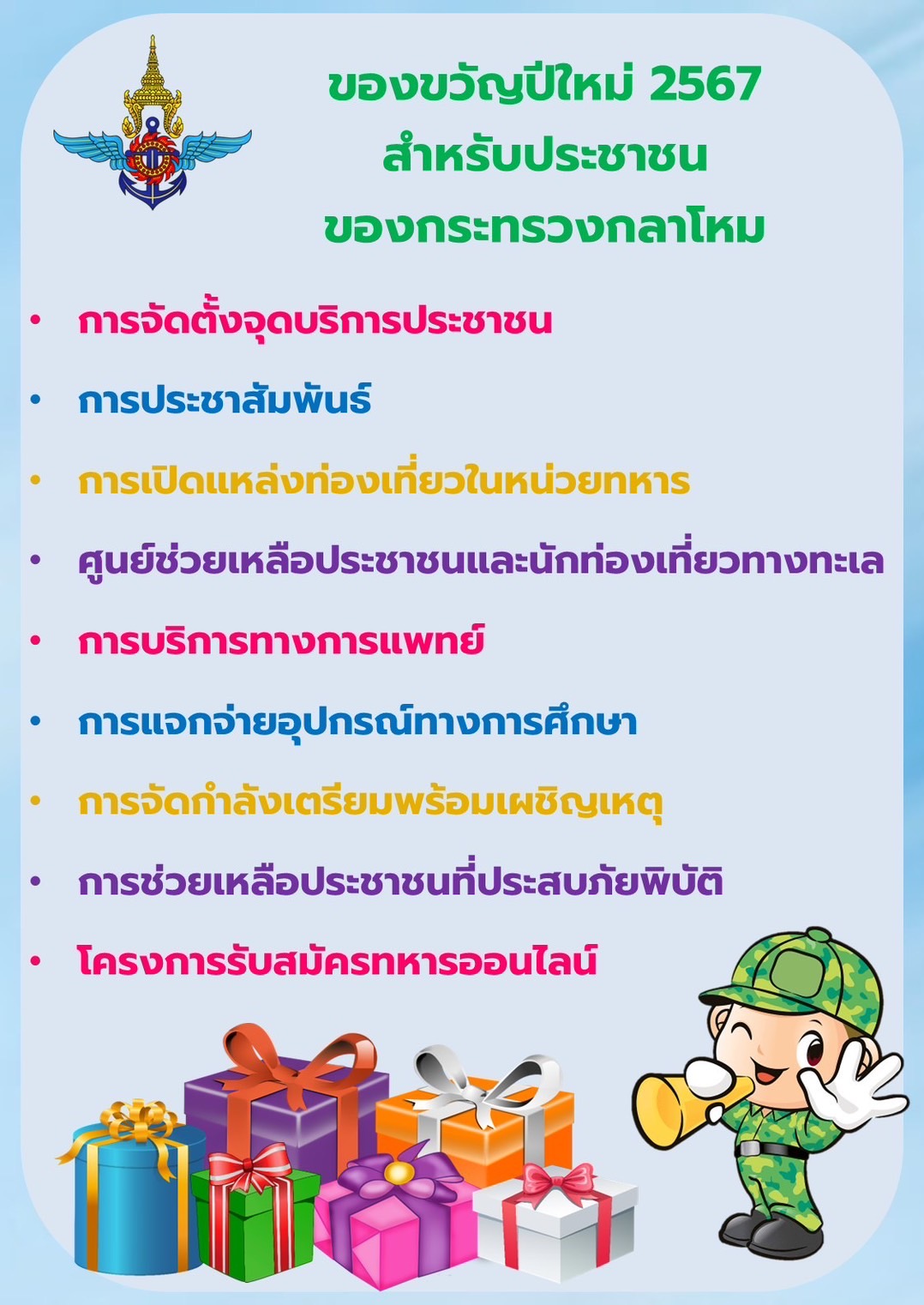 กระทรวงกลาโหมมอบของขวัญปีใหม่ให้ประชาชน ส่งสุขส่งท้ายปี 2566 ต้อนรับปี 2567 ผ่านกิจกรรม ดังนี้