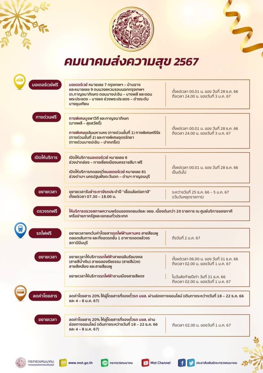 ยกเว้นค่าผ่านทางมอเตอร์เวย์หมายเลข 7 กรุงเทพฯ – บ้านฉาง และมอเตอร์เวย์ หมายเลข 9 ถนนวงแหวนรอบนอกกรุงเทพฯ (ถ.กาญจนาภิเษก) ตอนบางปะอิน – บางพลี และตอนพระประแดง – บางแค ช่วงพระประแดง – ต่างระดับบางขุนเทียน ระหว่างวันที่ 28 ธ.ค. 2566 เวลา 00.01 น. ถึงวันที่ 3 ม.ค. 2567 เวลา 24.00 น.