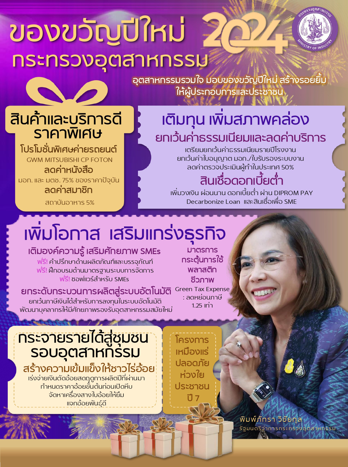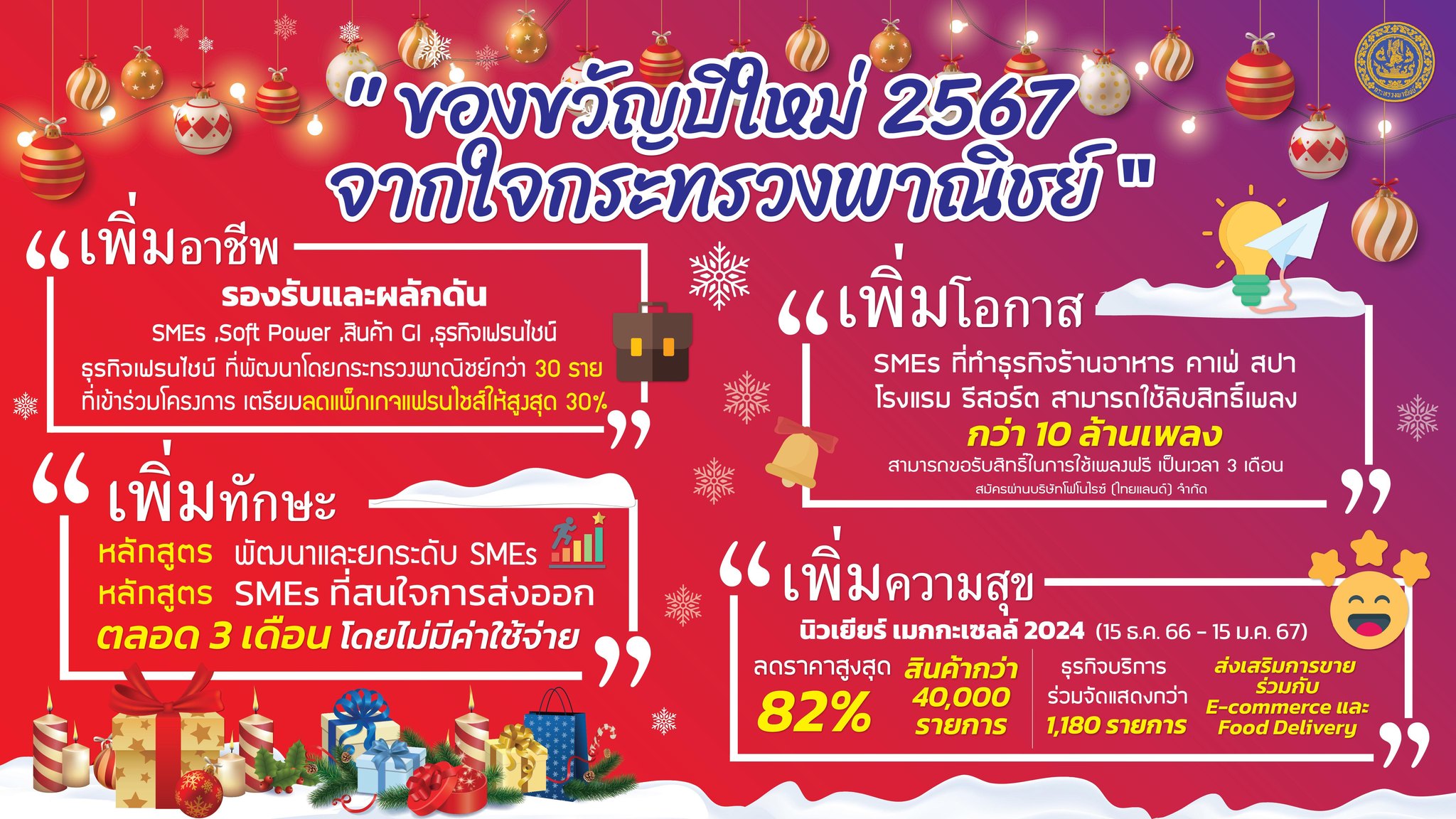 กระทรวงพาณิชย์มอบของขวัญปีใหม่ 2567 '4 เพิ่ม' คาดว่าจะช่วยลดค่าครองชีพสูงถึง 4,000 ล้านบาท ในส่วนของ SMEs จะสามารถลดรายจ่ายได้ 1,656 ล้านบาท โดยมี SMEs ที่ได้ประโยชน์มากกว่า 6,000 ราย และสามารถสร้างอาชีพใหม่ได้มากกว่า 20,000 ครัวเรือน