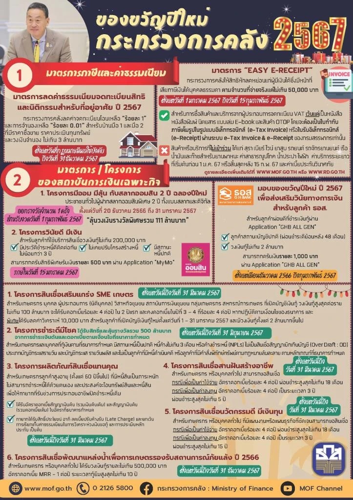 โครงการของขวัญปีใหม่ 2567 เพื่อส่งเสริมวินัยทางการเงินสำหรับลูกค้าธนาคารอาคารสงเคราะห์ (ธนาคารอาคารสงเคราะห์ : ธอส.) เพื่อส่งเสริมการมีวินัยทางการเงินในการผ่อนชำระเงินกู้เพื่อที่อยู่อาศัย และเติมกำลังซื้อเพื่อให้เกิดการใช้จ่ายหมุนเวียนในระบบเศรษฐกิจภายในประเทศช่วงเทศกาลปีใหม่ สำหรับการจ่ายชำระหนี้เงินกู้ผ่าน Application 'GHB ALL GEN' โดยได้รับเงินรายละ 1,000 บาท ตั้งแต่เดือนธันวาคม 2566-กุมภาพันธ์ 2567 ทั้งนี้ ตามหลักเกณฑ์และเงื่อนไขที่ธนาคารกำหนด