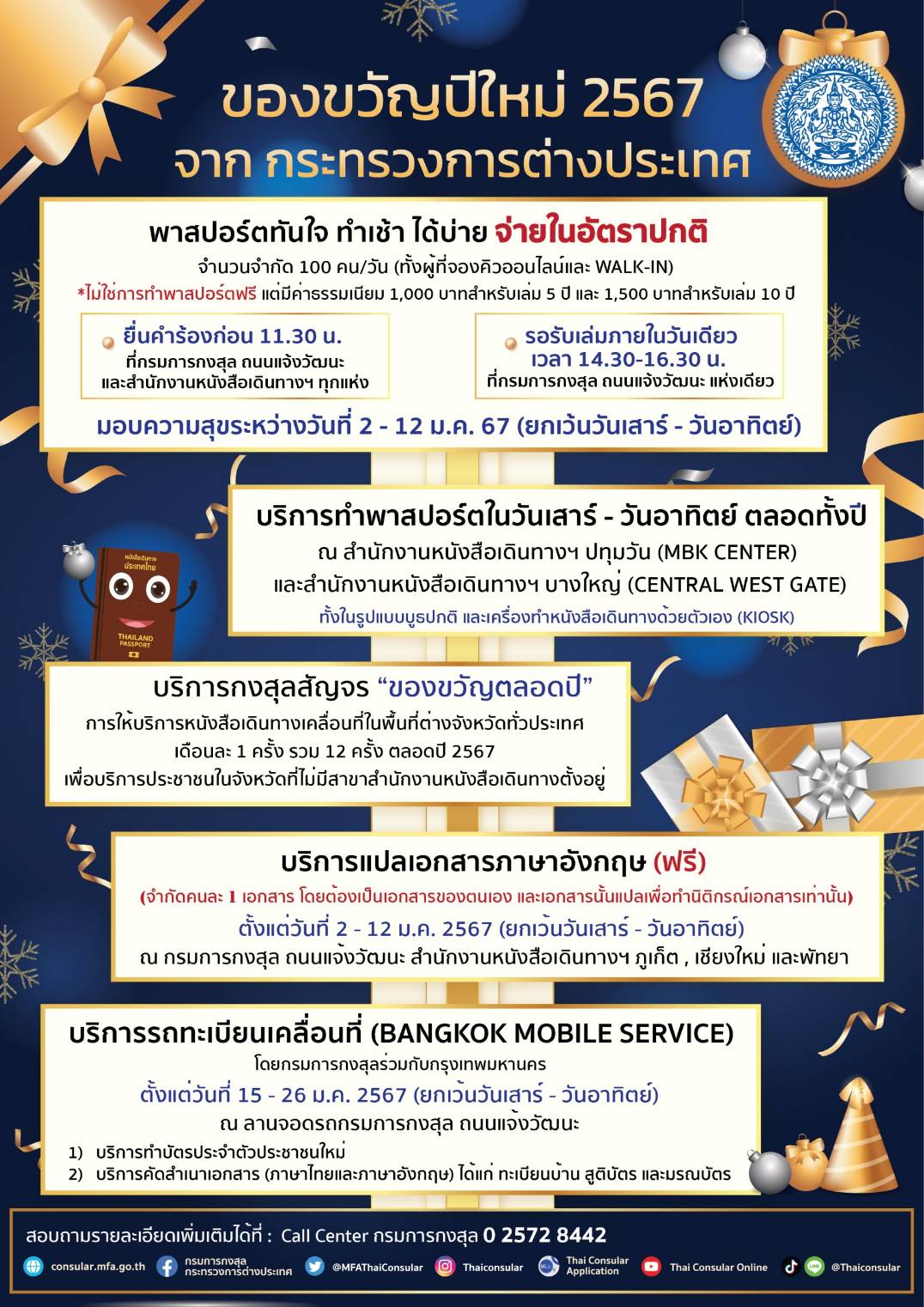 โครงการกรมธรรม์ประกันภัยรายย่อย (ไมโครอินชัวรันส์) สำหรับเทศกาลปีใหม่ 2567 (สำนักงานคณะกรรมการกำกับและส่งเสริมการประกอบธุรกิจประกันภัย : สำนักงาน คปภ.) โดยมี 2 ประเภทกรมธรรม์ ได้แก่ กรมธรรม์ประกันภัยกลุ่มปีใหม่เที่ยวได้อุ่นใจ (ไมโครอินชัวรันส์) ให้ความคุ้มครองสูงสุด 100,000 บาท คุ้มครองค่ารักษาพยาบาล 5,000 บาท และกรมธรรม์ประกันอัคคีภัยที่อยู่อาศัย ปีใหม่สุขใจ ฝากบ้านไว้กับประกันภัย (ไมโครอินชัวรันส์) ให้ความคุ้มครองสูงสุด 30,000 บาท คุ้มครองโจรกรรม 5,000 บาท ให้ความคุ้มครองระยะเวลา 30 วัน เบี้ยประกันภัย 10 บาท