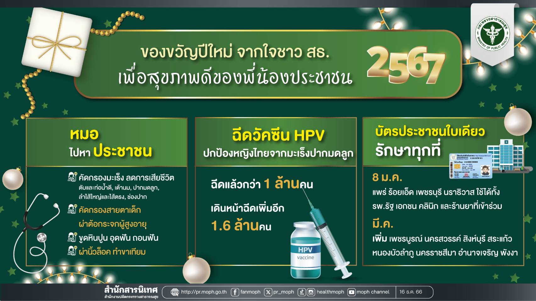 ฉีดวัคซีน HPV ปกป้องหญิงไทยจากมะเร็งปากมดลูก ปัจจุบันดำเนินการฉีดไปแล้วกว่า 1 ล้านคน และกำลังเดินหน้าดำเนินการฉีดเพิ่มอีก 1.6 ล้านคน