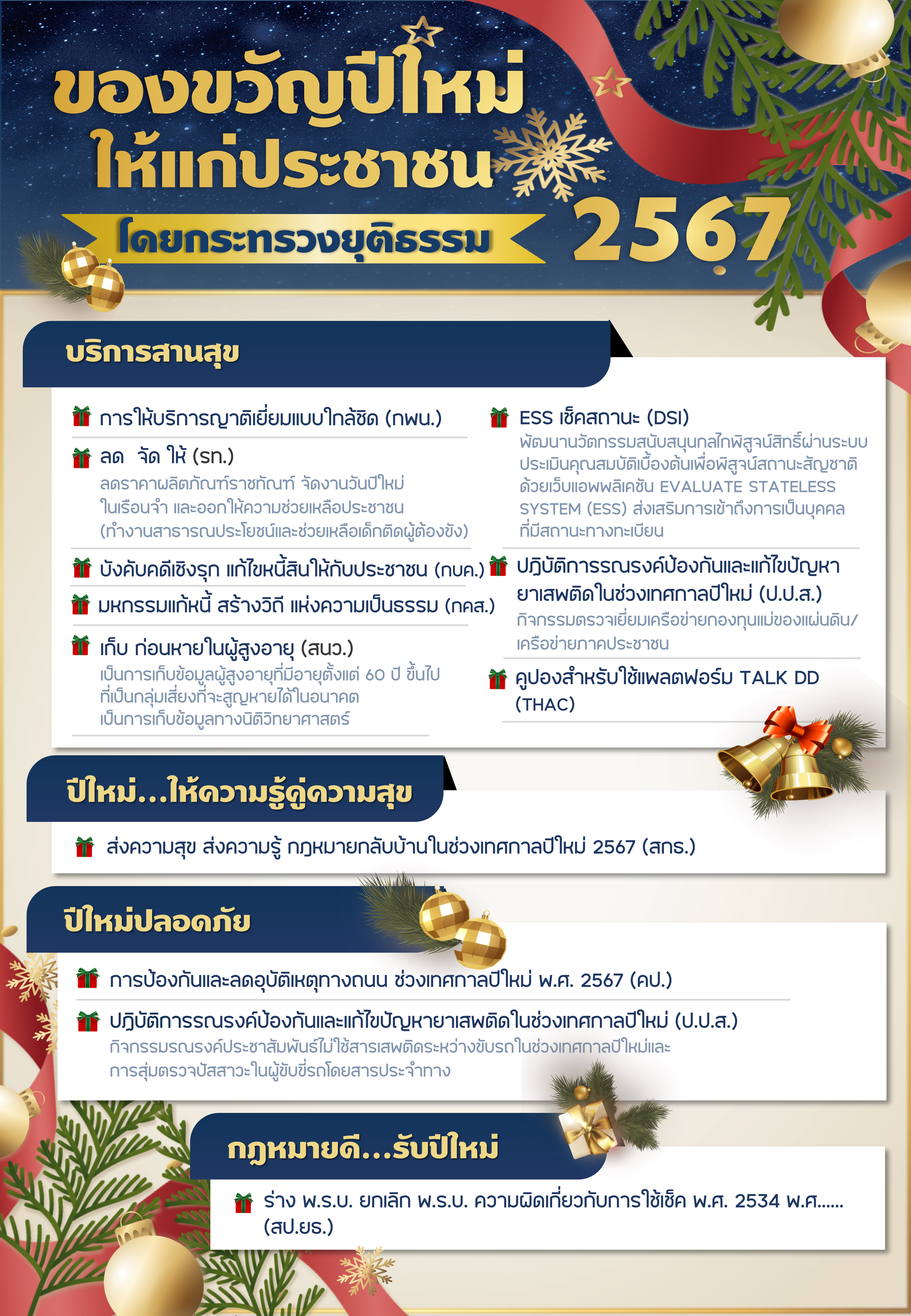 กระทรวงยุติธรรม พร้อมส่งความสุขเป็นของขวัญปีใหม่ 2567 ให้ประชาชน ภายใต้นโยบาย 'นำความยุติธรรมเข้าหาประชาชนอย่างทั่วถึง และถ้วนหน้า' ดังนี้