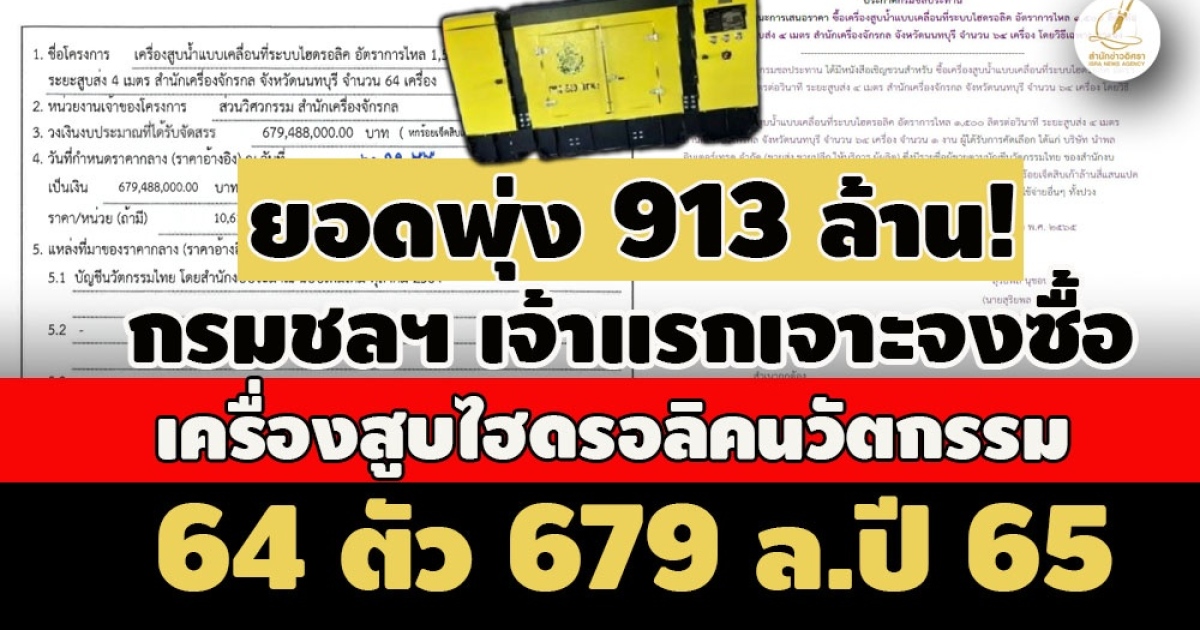 • ยอดพุ่ง 913 ล้าน! กรมชลฯ เจ้าแรกเจาะจงซื้อเครื่องสูบไฮดรอลิคนวัตกรรม 64 ตัว 679 ล.ปี 65