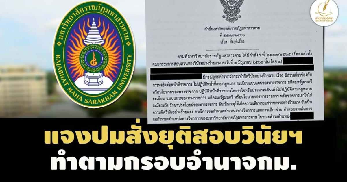 'กมล พลคำ อดีตรษก.อธิการ มรภ.สารคาม ยันออกคำสั่งยุติสอบวินัยร้ายแรงอาจารย์เอี่ยวกระบวนการขอตำแหน่งทางวิชาการบุคลากรมิชอบ ทำตามหน้าที่กรอบอำนาจกฎหมาย ยึดข้อเท็จจริง-คำวินิจฉัยศาล ไม่เช่นนั้นคงไม่กล้าตัดสินใจ แต่ไม่ขอลงรายละเอียด ด้าน ดร.เนตรชนก จันทร์สว่าง รษก.คนปัจจุบัน แจ้งสภาฯ ได้รับเอกสาร ปปป. มอบหมายผู้ช่วยฯ ตอบคำถามแล้ว