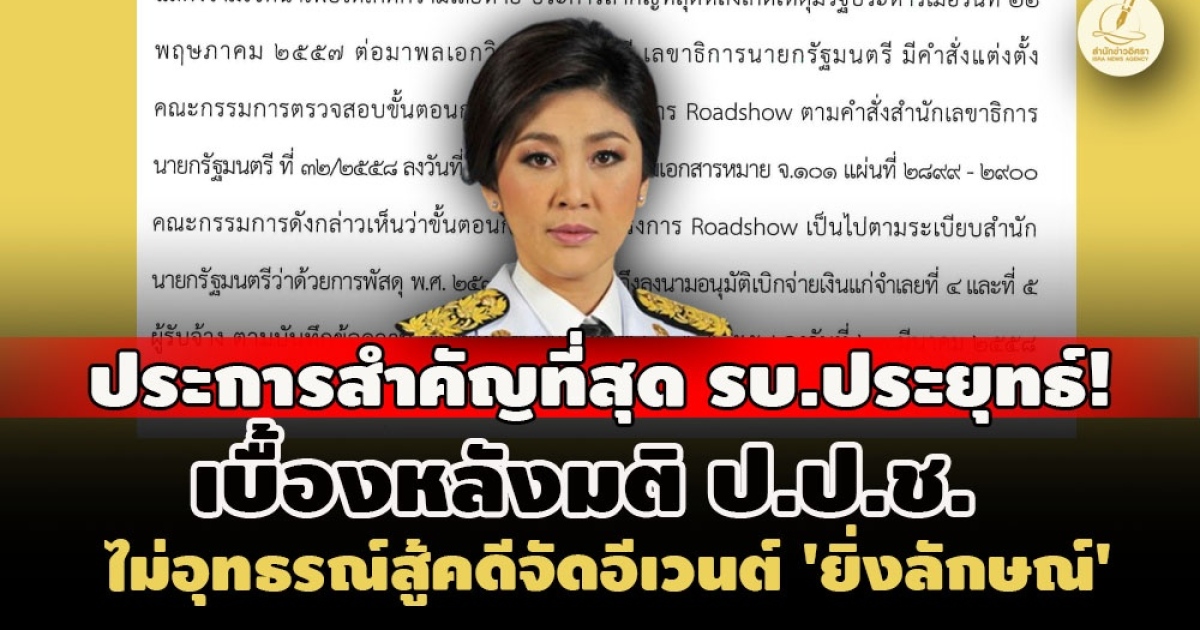 เหล่านี้ คือ ข้อมูลเบื้องหลังมติคณะกรรมการ ป.ป.ช. ไม่อุทธรณ์คดีกล่าวหา น.ส.ยิ่งลักษณ์ ชินวัตร อดีตนายกรัฐมนตรี และพวก กรณีปฏิบัติหรือละเว้นการปฏิบัติหน้าที่โดยมิชอบ ใช้อำนาจในตำแหน่งหน้าที่โดยทุจริต มุ่งหมายไม่ให้มีการแข่งขันเสนอราคาอย่างเป็นธรรม กรณีการจัดจ้างโครงการ Roadshow สร้างอนาคตประเทศไทย Thailand 2022 วงเงิน 240 ล้านบาท ที่สำนักข่าวอิศรา ตรวจสอบพบล่าสุด ในขณะนี้