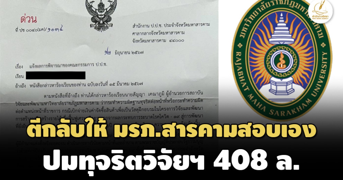 ป.ป.ช.ตีกลับข้อร้องเรียนทุจริตโครงการวิจัยฯ มรภ.มหาสารคาม 408 ล. ให้อธิการบดีดำเนินการ ด้าน ผอ.ป.ป.ช.สารคามเผยมีอีกหลายเรื่อง