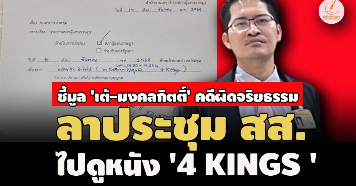 เผยมติป.ป.ช. 6 ต่อ 1 เสียง ชี้มูลความผิด 'เต้-มงคลกิตติ์ สุขสินธารานนท์' อดีต สส.พรรคไทยศรีวิไลย์ คดีผิดจริยธรรม ลาประชุมสภาฯ ไปดูหนัง '4 KINGS' - เจ้าตัวแจง 'อิศรา' ไม่เคยถูกเรียกชี้แจงแก้ข้อกล่าวหา มีหลักฐานยืนยันเพียบ