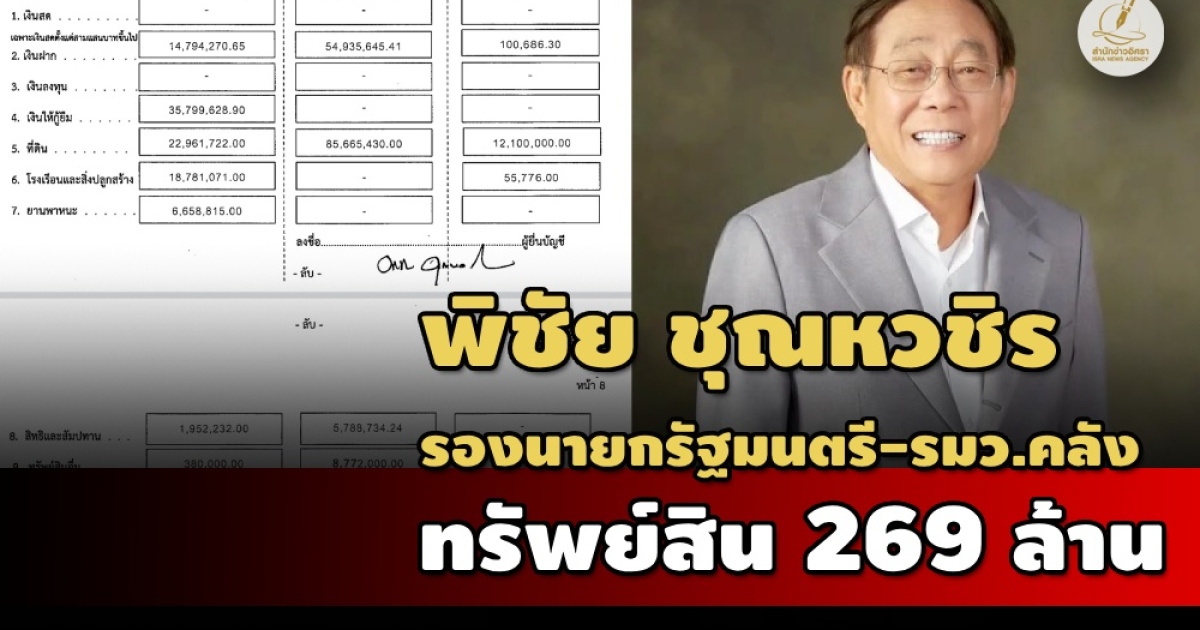 • 269 ล้าน! ทรัพย์สิน 'พิชัย ชุณหวชิร' รองนายกฯ-รมว.คลัง ที่ดิน 24 แปลง มีเงินให้กู้ 35.7 ล.