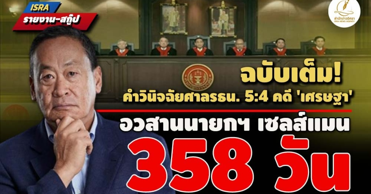สำนักข่าวอิศรา (www.isranews.org) รายงานไปแล้วว่า เมื่อวันที่ 14 ส.ค. 2567 ตุลาการศาลรัฐธรรมนูญ ได้อ่านคำวินิจฉัย ลงมติเสียงข้างมาก 5 ต่อ 4 ให้นายเศรษฐา ทวีสิน นายกรัฐมนตรีให้พ้นจากตำแหน่งนายกรัฐมนตรี พร้อมทั้งคณะรัฐมนตรีทั้งคณะ จากกรณีที่ประธานวุฒิสภาส่งคำร้องของสมาชิกวุฒิสภาจำนวน 40 คน ขอให้ศาลรัฐธรรมนูญวินิจฉัยตามรัฐธรรมนูญมาตรา 170 วรรคสาม ประกอบมาตรา 82 ว่า ความเป็นนายกรัฐมนตรีของนายเศรษฐา สิ้นสุดลงเฉพาะตัวตามรัฐธรรมนูญมาตรา 170 วรรคหนึ่ง (4) ประกอบมาตรา 160 (4) และ (5 )