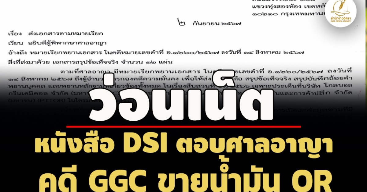 สำนักข่าวอิศรา (www.isranews.org) รายงานว่า ขณะนี้ได้มีผู้นำข้อมูลหนังสือกรมสอบสวนคดีพิเศษ (ดีเอสไอ) แจ้งตอบกลับศาลอาญา กรณีมีหมายเรียกพยานเอกสาร สรุปข้อเท็จจริง สรุปบันทึกถ้อยคำพยานบุคคล และพยานหลักฐานที่เกี่ยวข้องทั้งหมด ในเรื่องสืบสวนประเด็นที่บริษัท โกลบอลกรีนเคมิคอล จำกัด (มหาชน) (GGC) ลดราคาขายน้ำมัน B100 ให้กับบริษัท ปตท น้ำมันและการค้าปลีก จำกัด (มหาชน) (PTTOR) ในไตรมาสที่ 2/2566 ในคดีหมายเลขดำที่ อ.1260/2567 ลงวันที่ 14 ส.ค.2567 มาส่งแชร่ต่อในโลกออนไลน์