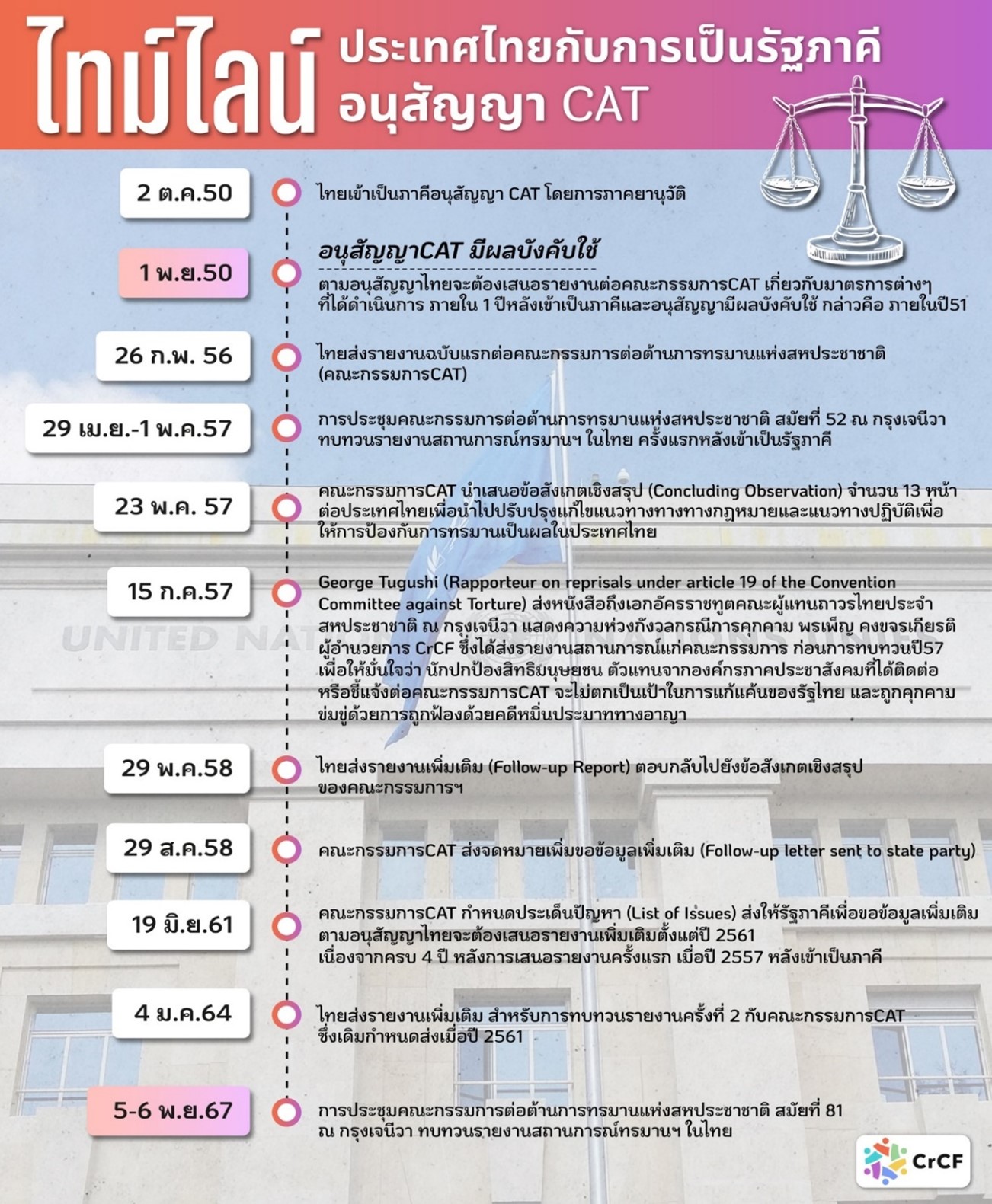 การทบทวนรายงานสถานการณ์กับคณะกรรมการ CAT เป็นครั้งที่ 2 ของประเทศไทยเกิดขึ้นในปีนี้ (2567) ในประชุมคณะกรรมการต่อต้านการทรมานแห่งสหประชาชาติ สมัยที่ 81 ณ กรุงเจนีวา เมื่อวันที่ 5-6 พฤศจิกายน 2567 แม้จะล่าช้าและห่างจากการทบทวนรายงานสถานการณ์ครั้งแรกเมื่อปี 2557 ถึงสิบปี ประเทศไทยได้ส่งตัวแทนเข้าร่วมการทบทวนรายงานสถานการณ์ฯ ครั้งนี้ด้วยความตั้งใจที่จะนำเสนอความก้าวหน้าโดยเฉพาะเรื่อง พ.ร.บ.ป้องกันและปราบปรามการทรมานและการกระทำให้สูญหายที่มีผลบังคับใช้แล้วเมื่อเดือนกุมภาพันธ์ 2566 โดยมีตัวแทนจากหน่วยงานรัฐไทยเข้าร่วมในการทบทวนรายงานมากถึง 36 คน จากมากกว่า 10 หน่วยงาน (ได้แก่ กระทรวงยุติธรรม รวมถึงกรมคุ้มครองสิทธิและเสรีภาพ กรมราชทัณฑ์ และกรมสอบสวนคดีพิเศษ, กระทรวงการต่างประเทศ, สำนักงานอัยการสูงสุด, สำนักงานศาลยุติธรรม, สำนักงานสภาความมั่นคงแห่งชาติ, สำนักงานตำรวจแห่งชาติ, สำนักงานตรวจคนเข้าเมือง, กระทรวงสาธารณสุข, กระทรวงมหาดไทย รวมถึงกรมการปกครอง, คณะผู้แทนถาวรไทย ประจำสหประชาชาติ ณ นครเจนีวา) หลังจากการทบทวนรายงานสถานการณ์ฯ คณะกรรมการCAT จึงได้นำเสนอข้อสังเกตเชิงสรุป (Concluding Observations) มายังประเทศไทย เมื่อวันที่ 22 พฤศจิกายน 2567 ที่ผ่านมา