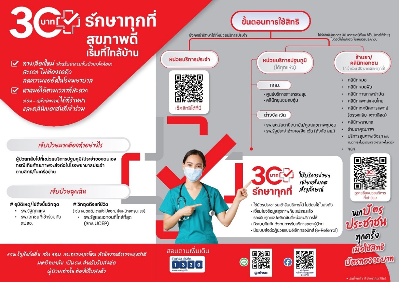 กระทรวงสาธารณสุขประกาศความก้าวหน้านโยบาย 30 รักษาทุกโรค รักษาทุกที่ การขับเคลื่อนตามนโยบายรัฐบาลดังกล่าว จะสามารถยกระดับการบริการด้านสุขภาพของหน่วยให้บริการ ให้อำนวยความสะดวกประชาชน โดยไม่ต้องรอคิวมาก รอรับยานาน ตรวจเสร็จรับยาที่บ้าน Health Rider ที่ผ่านมา ประชาชนพอใจการได้รับบริการเกือบ 100 %