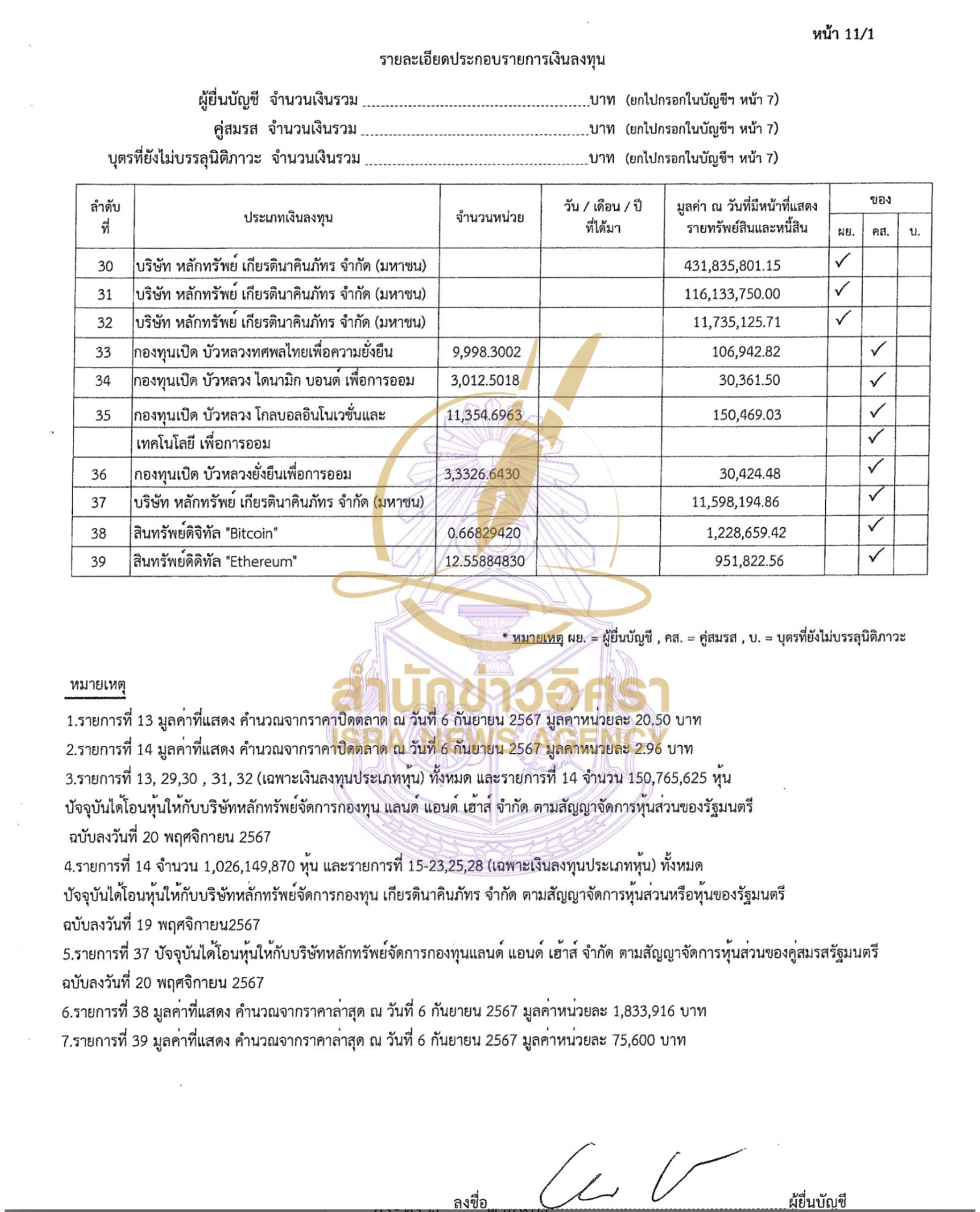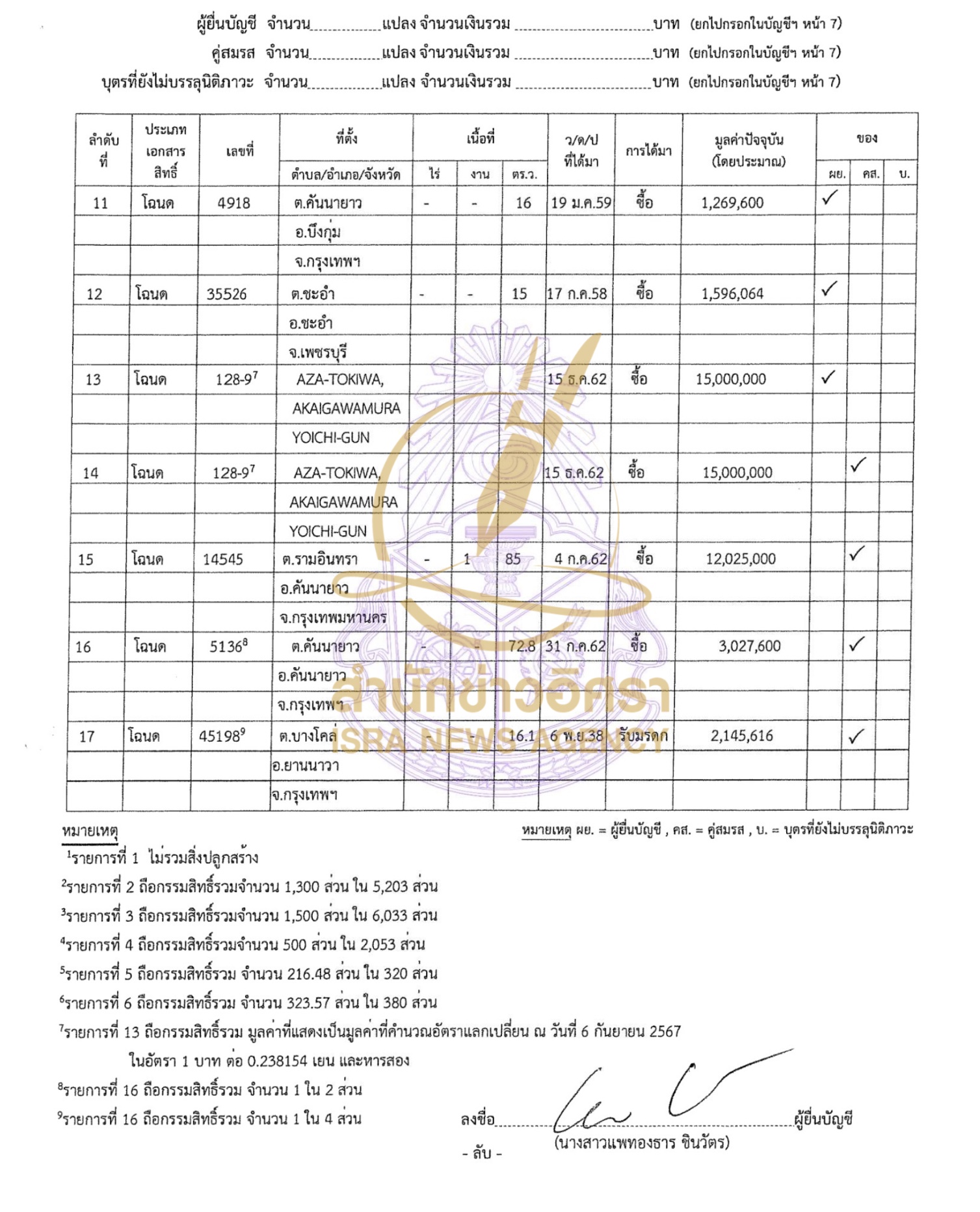 สำนักข่าวอิศรา (www.isranews.org) รายงานว่า เมื่อวันที่ 3 ม.ค. 2568 สำนักงานคณะกรรมการการป้องกันและปราบการทุจริตแห่งชาติ (ป.ป.ช.) เปิดเผยบัญชีแสดงรายการทรัพย์สินและหนี้สินรัฐมนตรี ราย นางสาวแพทองธาร ชินวัตร นายกรัฐมนตรี กรณีเข้ารับตำแหน่ง เมื่อวันที่ 6 ก.ย. 2567