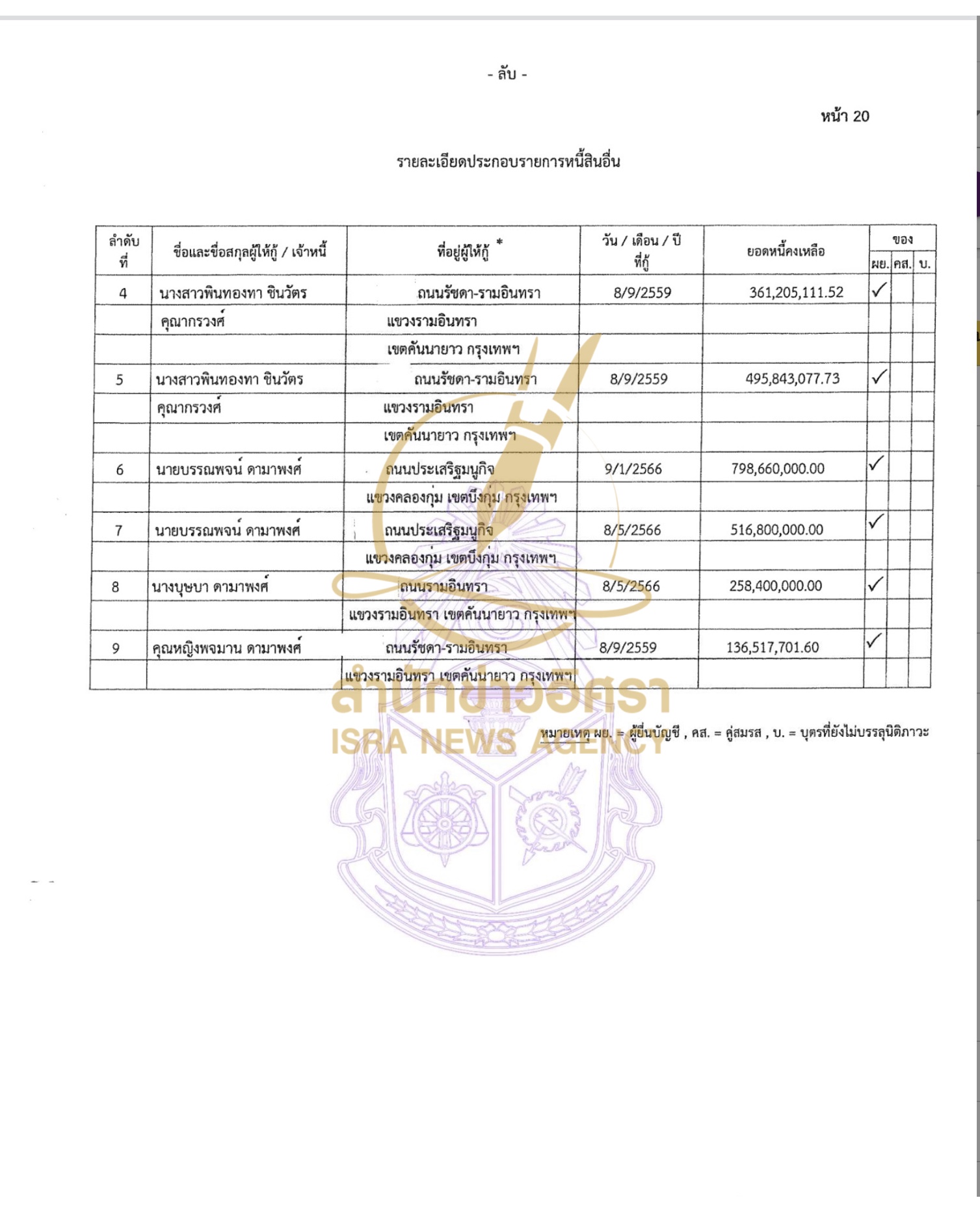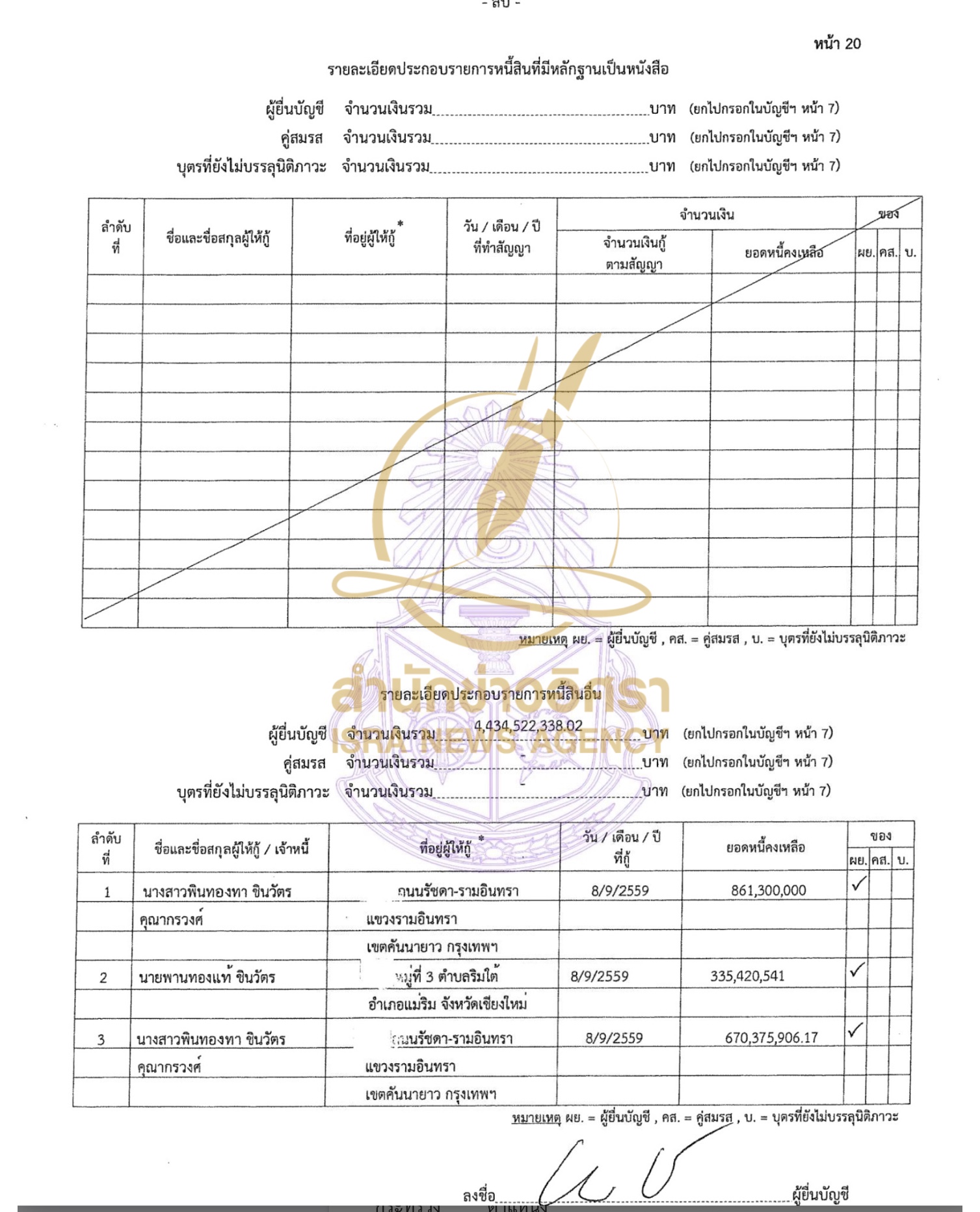 นางสาวแพทองธาร นายปิฎก สุขสวัสดิ์ ผู้อยู่กินฉันสามีภริยาตามที่ ป.ป.ช. กำหนด และบุตรที่ยังม่บรรลุนิติภาวะ แจ้งมีทรัพย์สินทั้งสิ้น 13,993,826,903 บาท หนี้สินทั้งสิ้น 4,441,159,711 บาท