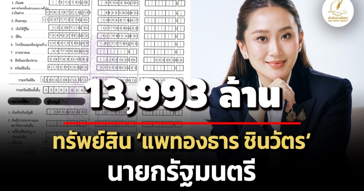 ป.ป.ช. เปิดทรัพย์สิน 'แพทองธาร ชินวัตร' นายกรัฐมนตรี ทรัพย์สิน 13,993 ล. เงินลงทุน 1.1 หมื่นล. รายได้ 265 ล./ปี