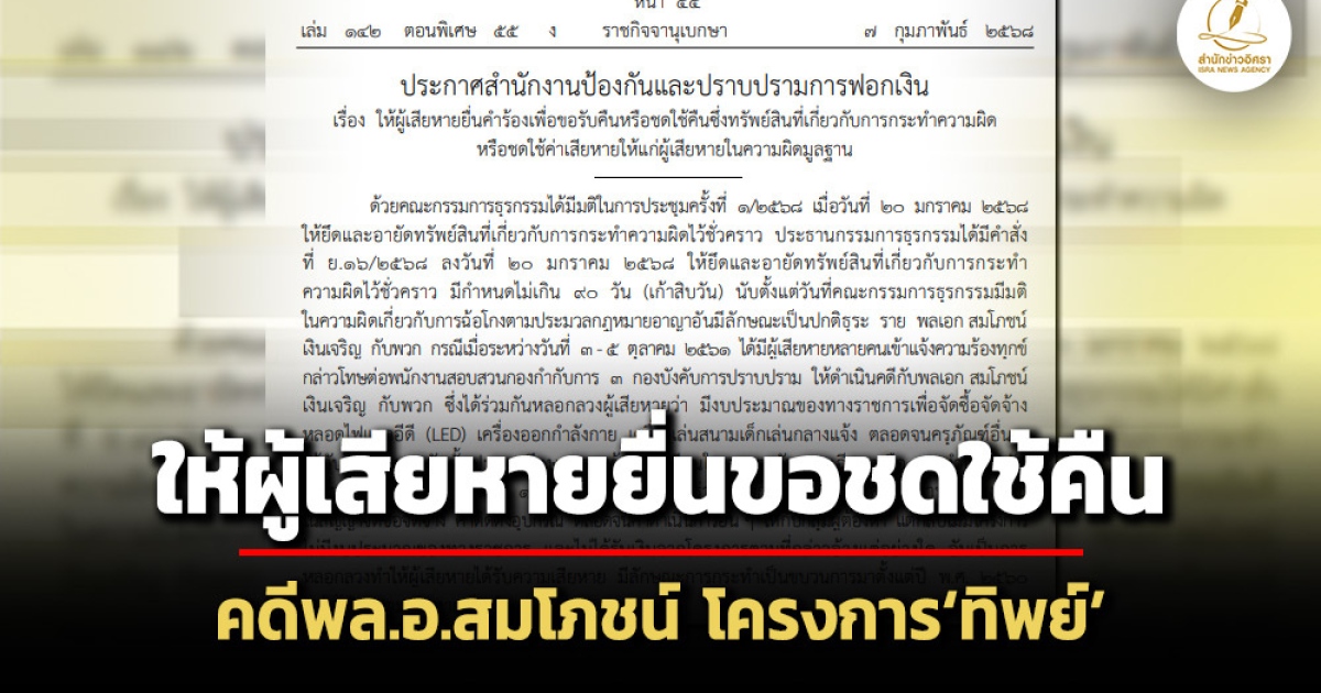 • ปปง.ให้ผู้เสียหายยื่นขอชดใช้คืน คดี พล.อ.สมโภชน์-พวก ฉ้อโกงเอกชนโครงการ‘ทิพย์’