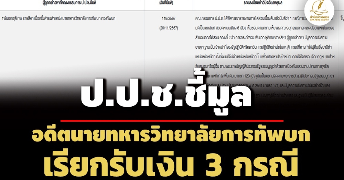 • ป.ป.ช.ชี้มูลอดีตนายทหารวิทยาลัยการทัพบก เรียกรับเงิน 3 กรณี - แต่ไม่เปิดข้อกล่าวหา