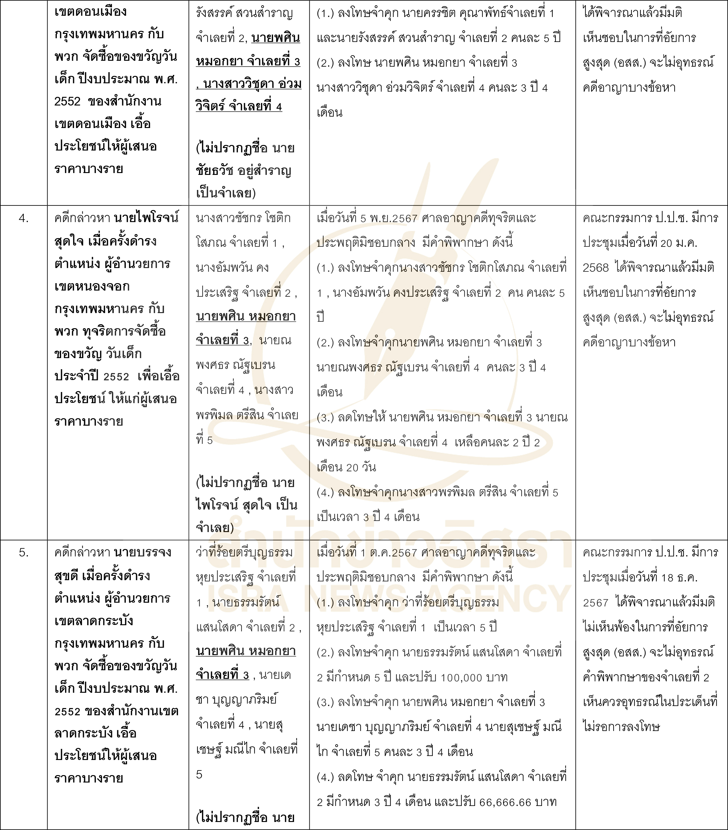 "...มีจำนวนสำนักงานเขตในกทม. ที่เกิดปัญหาคดีทุจริตการจัดซื้อของขวัญวันเด็กปีงบประมาณ พ.ศ. 2552 ถูกคณะกรรมการ ป.ป.ช.ชี้มูลความผิด และศาลมีคำพิพากษาตัดสินลงโทษจำคุกจำเลยที่เกี่ยวข้องไปแล้ว ถึง 7 เขต รวมจำนวนจำเลยหลายสิบคน โดนคุกคนละหลายปี ไม่รอลงอาญา ขณะที่ทั้ง 7 คดี มีจำเลยคนเดียวกันเข้าไปเกี่ยวข้อง คือ "นายพศิน หมอกยา"..."