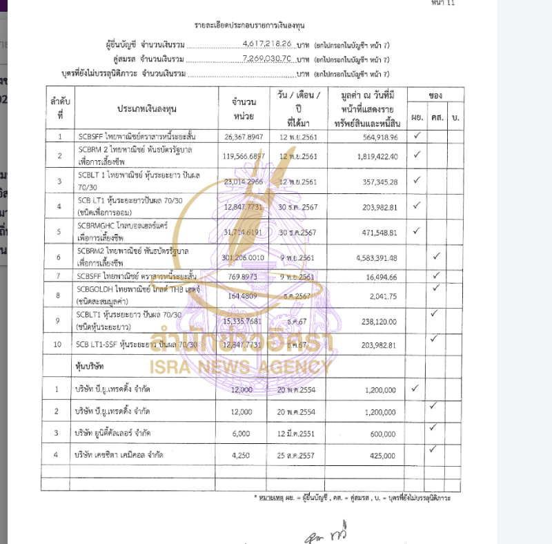 ทั้งนี้นางยุพา แจ้งมีรายได้ต่อปีโดยประมาณ 12,498,483 บาท ประกอบด้วย เงินเดือน 2,224,883 บาท เบี้ยประชุม 153,600 บาท ปันผล 10,120,000 บาท แจ้งมีรายจ่ายต่อปีโดยประมาณ 2,171,478 บาท