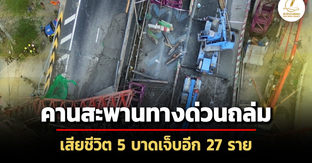 โครงสร้างคานสะพานทางด่วน พระราม 2 ทรุดตัวพังถล่ม ซากเหล็กและคอนกรีตทับคนงานเสียชีวิต 5 บาดเจ็บอีก 30 สูญหาย 2 ราย