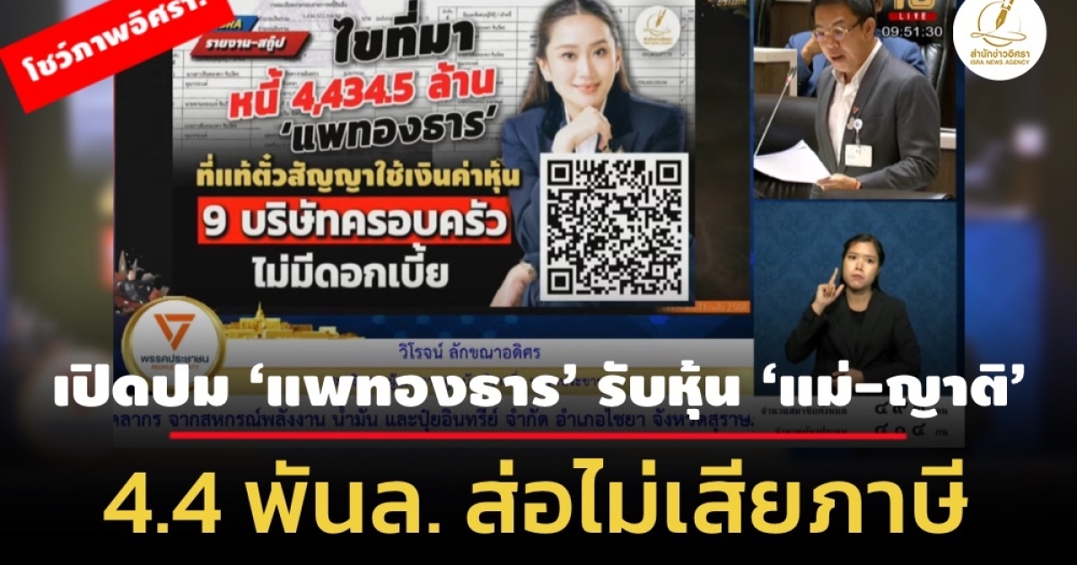 ‘วิโรจน์ ลักขณาอดิศร’ เปิดปม ‘แพทองธาร ชินวัตร’ ส่อเลี่ยงภาษีรับให้ 18.2 ล. กรณีโอนหุ้น 2 บริษัท ‘อัลไพน์-ประไหมสุรี’ ให้ ‘แม่-พี่สาว’ พ่วงชำแหละปมใหญ่ออกตั๋ว PN 9 บริษัท 4.4 พันล้าน ส่อหนีภาษี-ใช้ภาพ ‘อิศรา’ ประกอบการอภิปราย