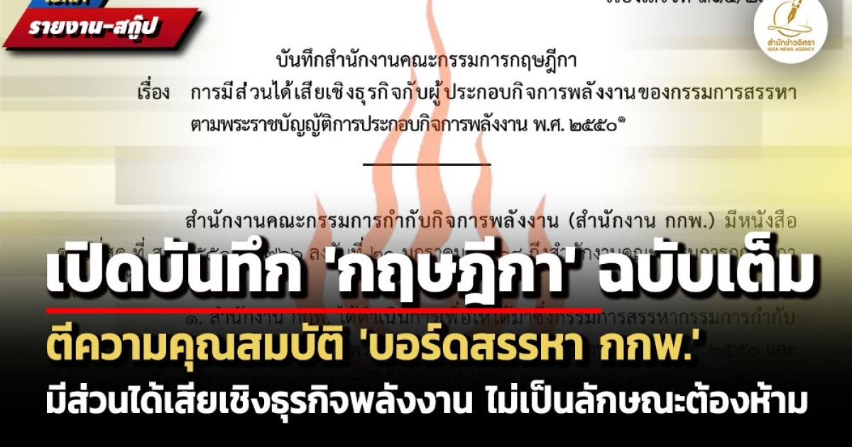 สำนักข่าวอิศรา (www.isranews.org.) ขอนำฉบับเต็ม เรื่องเสร็จที่ 315/2568 บันทึกสำนักงานคณะกรรมการกฤษฎีกา เรื่อง การมีส่วนได้เสียเชิงธุรกิจกับผู้ประกอบกิจการพลังงานของกรรมการสรรหาตาม พ.ร.บ. การประกอบกิจการพลังงาน พ.ศ. 2550 ดังต่อไปนี้