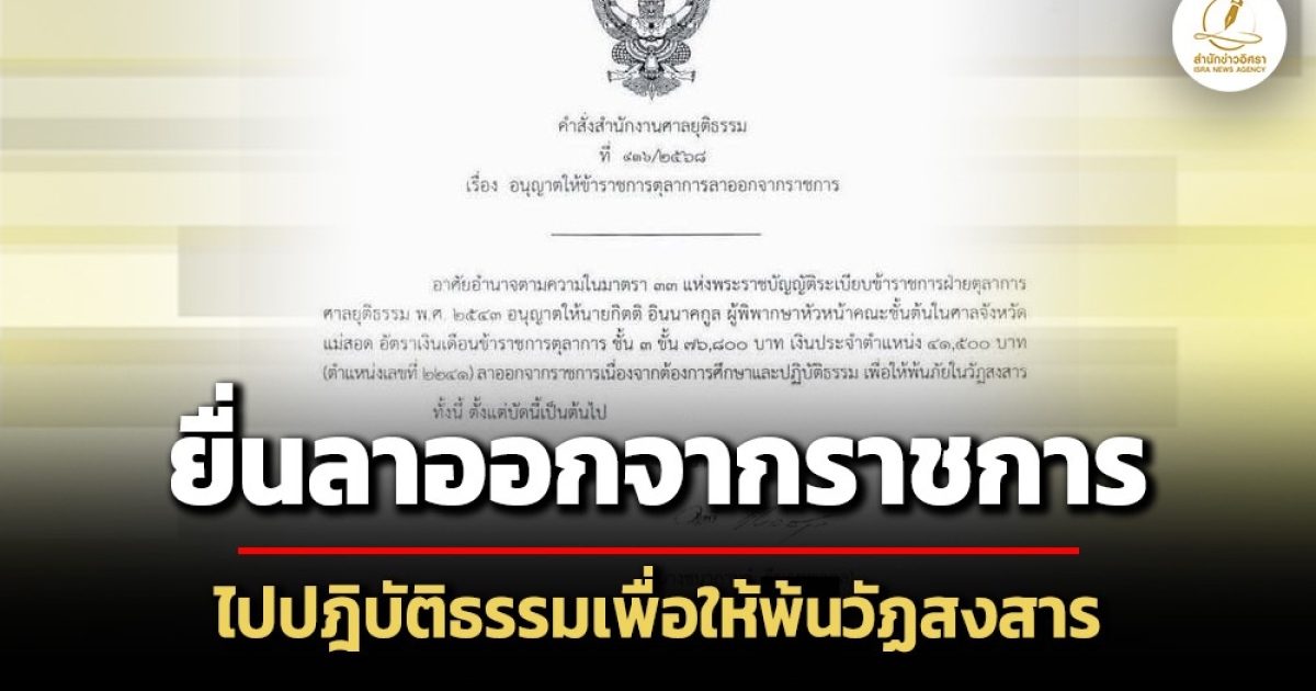 ประธานศาลฎีกาลงนามอนุญาตให้ผู้พิพากษาหัวหน้าคณะชั้นต้นศาลจังหวัดแม่สอด ลาออกเพื่อศึกษา-ปฏิบัติธรรรม เพื่อให้พ้นภัยในวัฏสงสาร