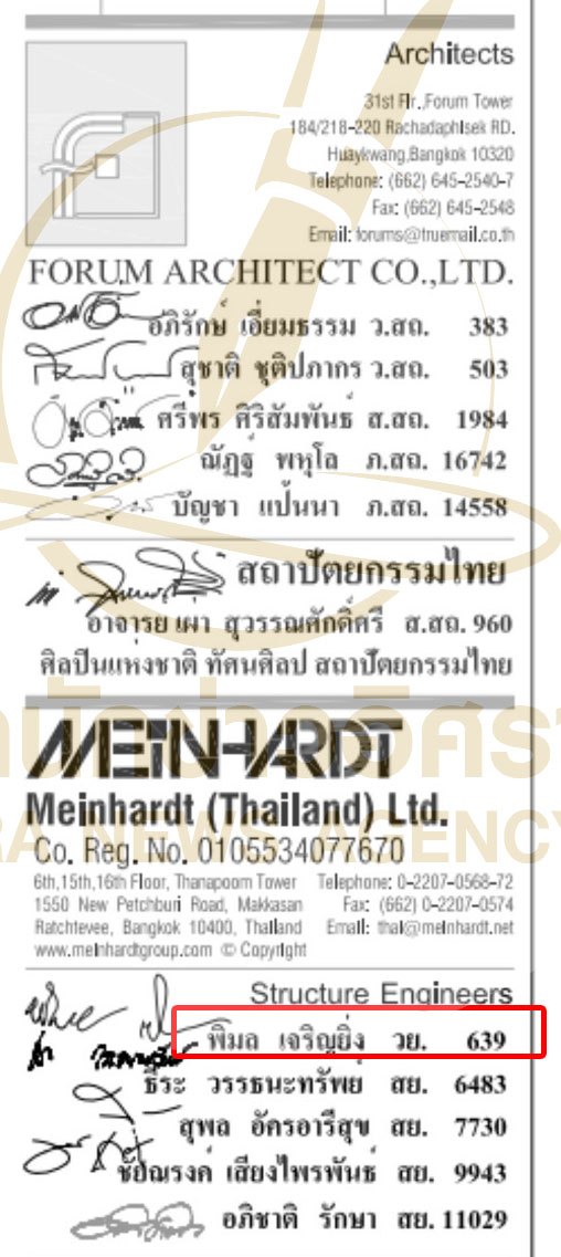 โดยปรากฏชื่ออยู่ในทีมวิศวกรโครงสร้างของ บริษัท ไมนฮาร์ท (ประเทศไทย) จำกัด