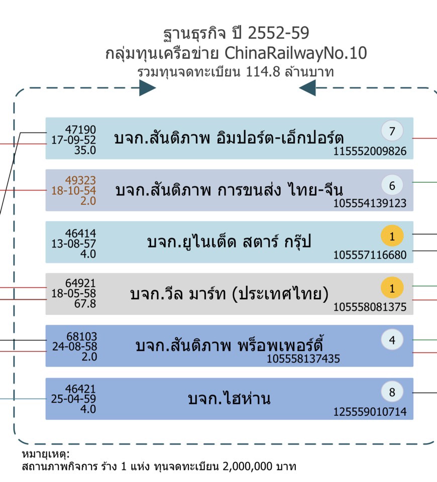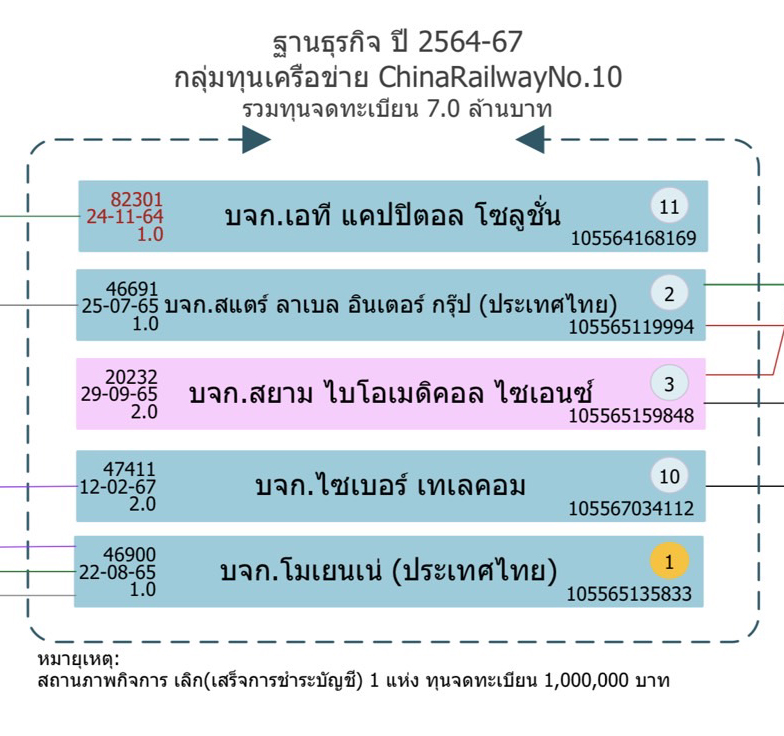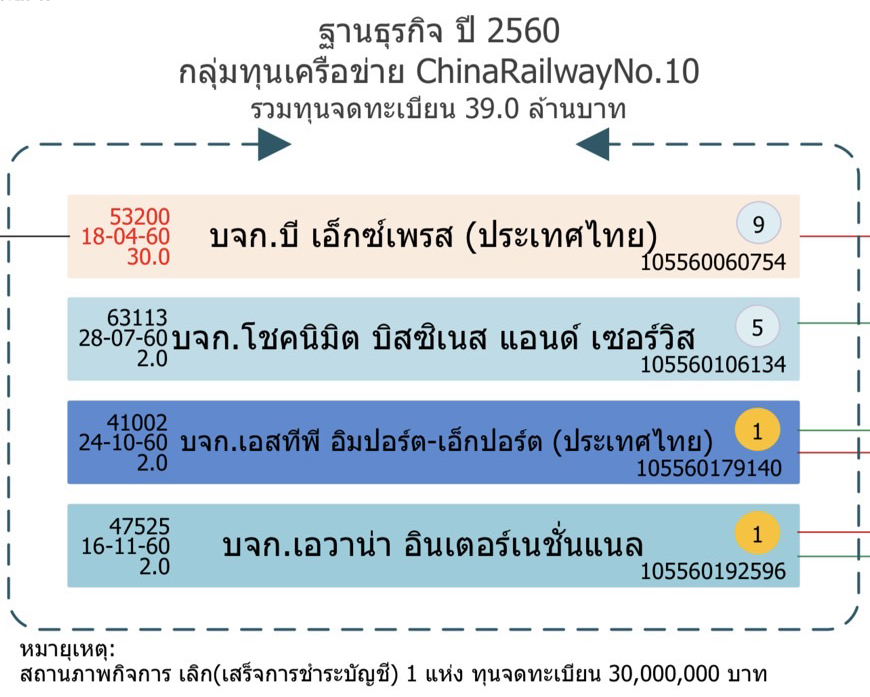 ช่วงปี 2564-2567 กลุ่มทุนเครือข่าย ChinaRailwayNo.10 มีจำนวน 5 แห่ง รวมทุนจดทะเบียน 7 ล้านบาท
