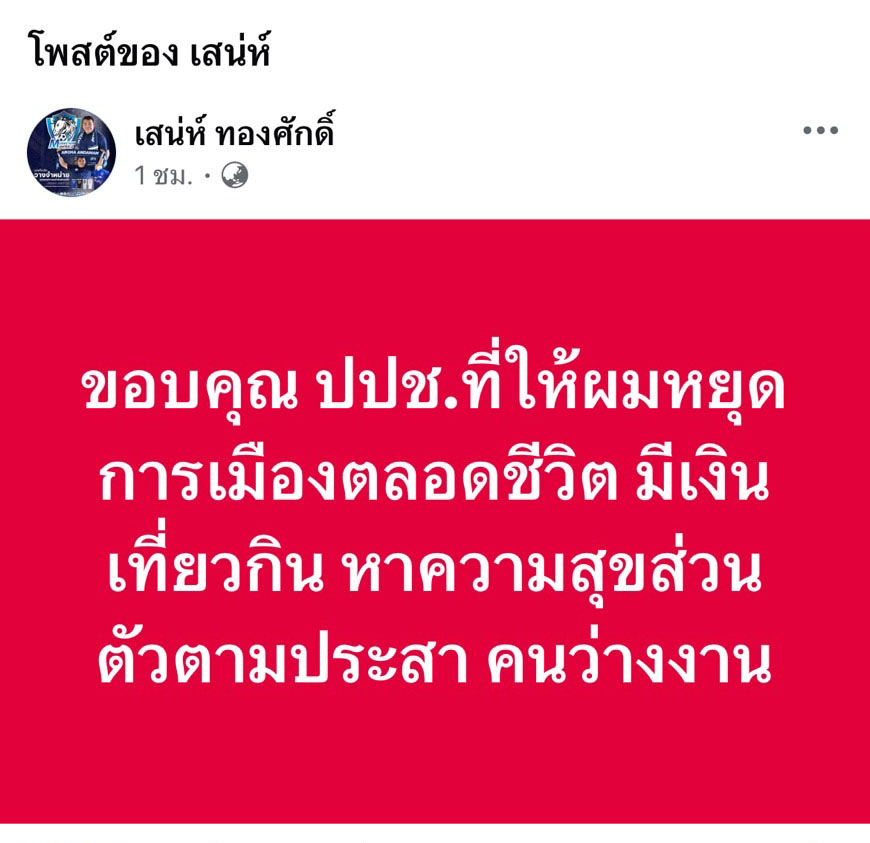 ภายหลังจากศาลฯ มีคำพิพากษา เฟซบุ๊กส่วนตัว นายเสน่ห์ ทองศักดิ์ ระบุข้อความว่า “ขอบคุณ ปปช.ที่ให้ผมหยุดการเมืองตลอดชีวิต มีเงินเที่ยวกิน หาความสุขส่วนตัวตามประสา คนว่างงาน” มีคนรู้จัก เข้าไปโพสต์ข้อความให้กำลังใจเป็นจำนวนมาก