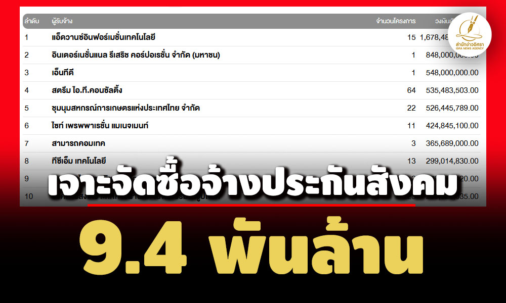 จากกรณีสำนักข่าวอิศรา (www.isranews.org) สำรวจข้อมูลงานจัดซื้อจัดจ้างหน่วยงานภาครัฐจากเว็บไซต์ ACT AI พบว่า ในส่วนของสำนักงานประกันสังคม ปัจจุบันใช้งบประมาณจัดซื้อไปแล้วกว่า 9,489,780,824.39 บาท โดยรายชื่อผู้รับจ้างที่ได้รับงบประมาณมากที่สุด คือ บริษัท แอ็ดวานซ์อินฟอร์เมชั่นเทคโนโลยี จำกัด (มหาชน) หรือ เอไอที วงเงิน 1,678,481,362 บาท จาก 15 โครงการ