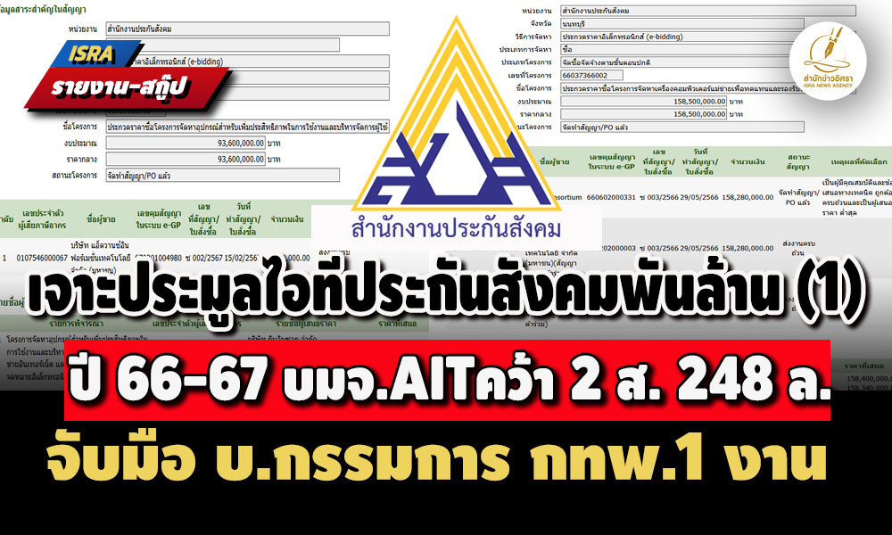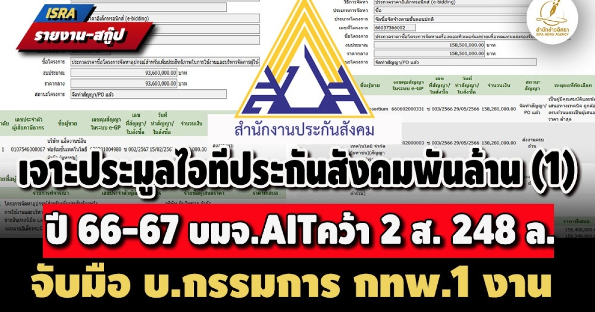 ไขความจริง! สนง.ประกันสังคมประมูลงานไอที ปี 2564 - 2567 วงเงิน 5,000 ล้าน เอกชน 2-3 บริษัท หมุนเวียนสลับกันเป็นผู้ชนะ 'อิศรา' ประเดิมเจาะปี 66-67 พบ บมจ.AIT คว้า 2 โครงการรวด 248 ล้าน เผยดำเนินการในนามกิจการร่วมค้า บ.'ชัยทัต แซ่ตั้ง' กรรมการ กทพ. 1 สัญญา 158 ล้าน