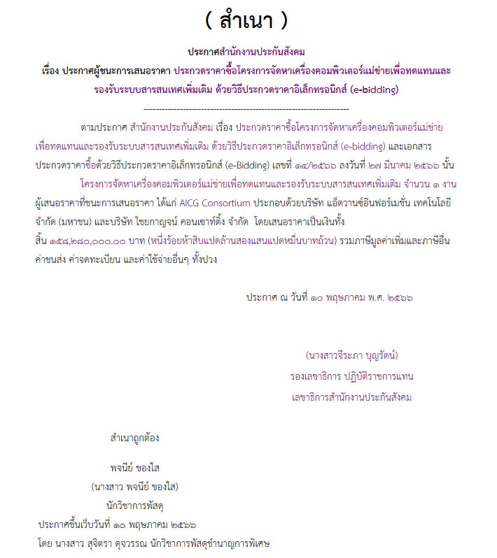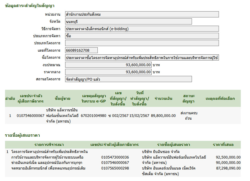ล่าสุด สำนักข่าวอิศรา ตรวจสอบฐานข้อมูลจัดซื้อจัดจ้างของสำนักงานประกันสังคม ในส่วนที่เกี่ยวข้องกับโครงการด้านไอที พบว่า ในช่วงปี 2566-2567 มีการจัดซื้อจัดจ้างจำนวน 2 โครงการ คือ 1. โครงการจัดหาอุปกรณ์สำหรับเพิ่มประสิทธิภาพในการใช้งานและบริหารจัดการผู้ใช้งานระบบเครือข่ายอินเทอร์เน็ต และอุปกรณ์ป้องกันการบุกรุกจดหมายอิเล็กทรอนิกส์ เพื่อทดแทนอุปกรณ์เดิม ด้วยวิธีประกวดราคาอิเล็กทรอนิกส์ (e-bidding) วงเงินตามสัญญาจ้าง 89,800,000 บาท และ 2. งานประกวดราคาซื้อโครงการจัดหาเครื่องคอมพิวเตอร์แม่ข่ายเพื่อทดแทนและรองรับระบบสารสนเทศเพิ่มเติม ด้วยวิธีประกวดราคาอิเล็กทรอนิกส์ (e-bidding) วงเงินตามสัญญาจ้าง 158,280,000 บาท