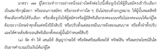มาตรา 77 ผู้ใดกระทําการอย่างหนึ่งอย่างใดดังต่อไปนี้เพื่อจูงใจให้ผู้อื่นสมัครเข้ารับเลือกเป็นสมาชิกวุฒิสภา หรือถอนการสมัคร หรือกระทําการใด ๆ อันไม่ชอบด้วยกฎหมาย ให้ผู้นั้นหมดสิทธิที่จะเลือกหรือได้รับเลือก หรือเพื่อจูงใจให้ผู้สมัครหรือผู้มีสิทธิเลือกลงคะแนนหรือไม่ลงคะแนนให้แก่ผู้ใด