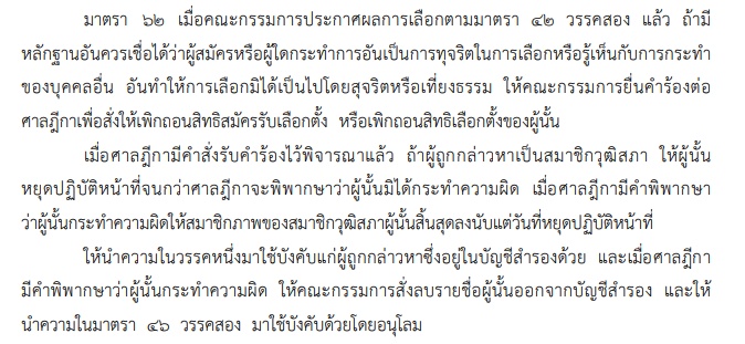 เมื่อคณะกรรมการประกาศผลการเลือกตามมาตรา 42 วรรคสอง แล้ว ถ้ามี หลักฐานอันควรเชื่อได้ว่าผู้สมัครหรือผู้ใดกระทําการอันเป็นการทุจริตในการเลือกหรือรู้เห็นกับการกระทํา ของบุคคลอื่น อันทําให้การเลือกมิได้เป็นไปโดยสุจริตหรือเที่ยงธรรม ให้คณะกรรมการยื่นคําร้องต่อ ศาลฎีกาเพื่อสั่งให้เพิกถอนสิทธิสมัครรับเลือกตั้ง หรือเพิกถอนสิทธิเลือกตั้งของผู้นั้น