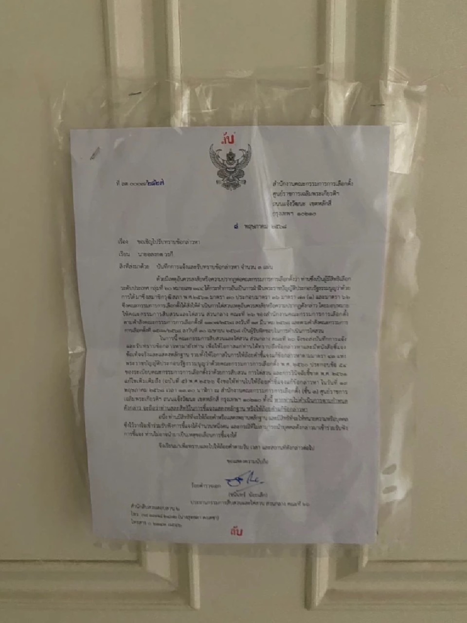 ในการนี้ คณะกรรมการสืบสวนและไต่สวน ส่วนกลาง คณะที่ 26 จึงขอส่งบันทึกการแจ้งและรับทราบข้อกล่าวหามายังท่าน เพื่อให้โอกาสแก่ท่านได้ทราบถึงข้อกล่าวหาและมีหนังสือชี้แจงข้อเท็จจริงและแสดงหลักฐาน รวมทั้งให้โอกาสในการให้ถ้อยคำชี้แจงแก้ข้อกล่าวหาตามมาตรา 43 แห่งพระราชบัญญัติประกอบรัฐธรรมนูญว่าด้วยคณะกรรมการการเลือกตั้ง พ.ศ. 2560 ประกอบข้อ 54 ของระเบียบคณะกรรมการการเลือกตั้งว่าด้วยการสืบสวน การไต่สวน และการวินิจฉัยชี้ขาด พ.ศ.2561 แก้ไขเพิ่มเติมถึง (ฉบับที่ 5) พ.ศ.2566 จึงขอให้ท่านไปให้ถ้อยคำชี้แจงแก้ข้อกล่าวหา ในวันที่ 19 พฤษภาคม 2568 เวลา 13.00 นาฬิกา ณ สำนักงานคณะกรรมการการเลือกตั้ง (ชั้น 3) ศูนย์ราชการเฉลิมพระเกียรติฯ ถนนแจ้งวัฒนะ เขตหลักสี่ กรุงเทพฯ 10210