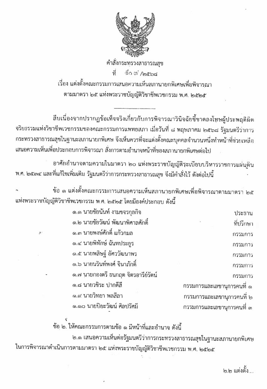 ถัดมาเพียง 1 วัน เมื่อวันที่ 16 พ.ค. 2568 มีความเคลื่อนไหวในกระทรวงสาธารณสุข นายสมศักดิ์ เทพสุทิน รมว.สาธารณสุข ลงนามคำสั่งกระทรวงสาธารณสุขที่ 807/2568 วันที่ 15 พ.ค. 2568 เรื่อง แต่งตั้งคณะกรรมการเสนอความเห็นสภานายกพิเศษเพื่อพิจารณา ตามมาตรา 25 แห่ง พ.ร.บ.วิชาชีพเวชกรรม พ.ศ.2525 มีจำนวน 10 คน แบ่งเป็น ประธาน 1 คน ที่ปรึกษา 1 คน กรรมการ 8 คน